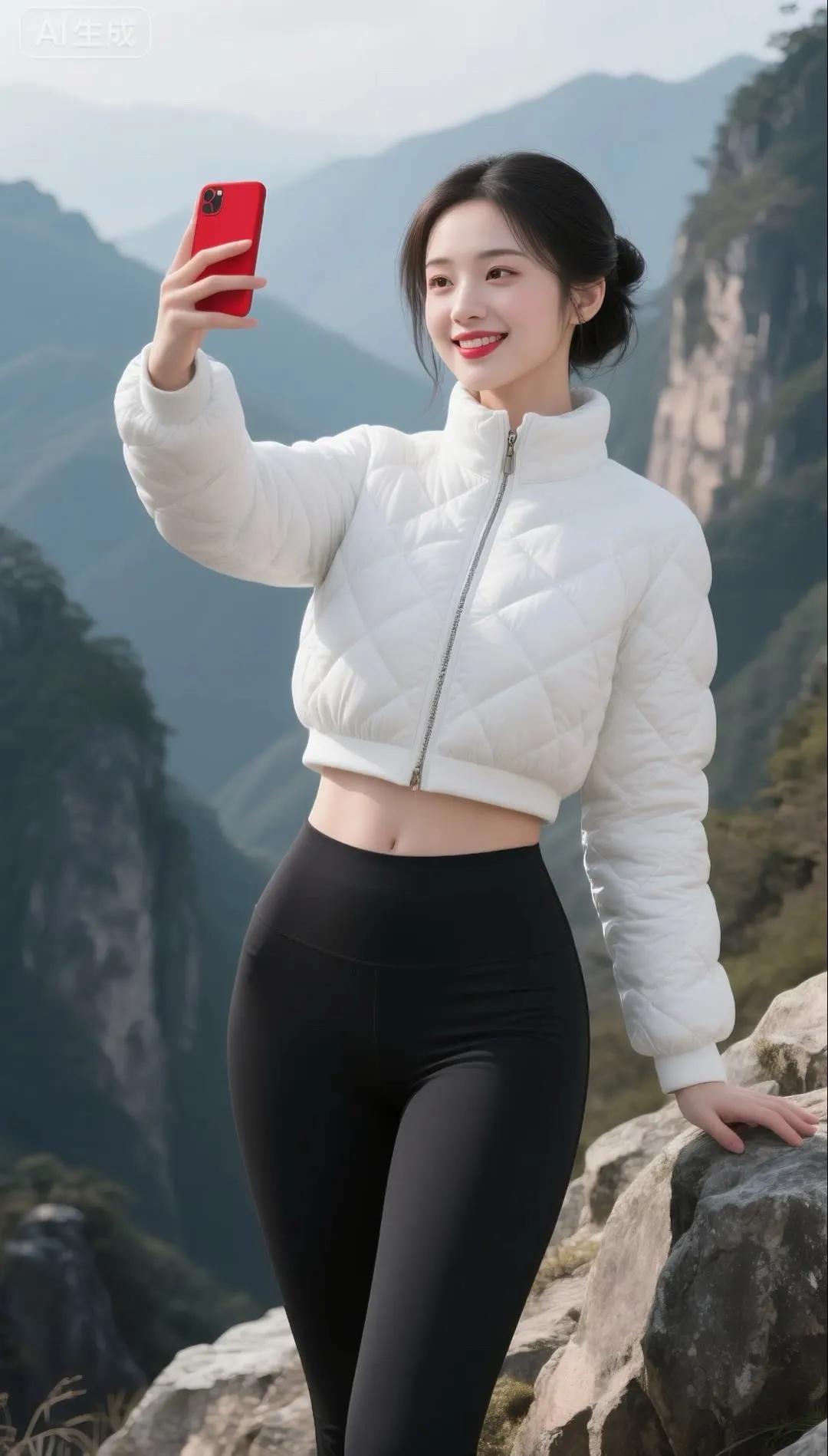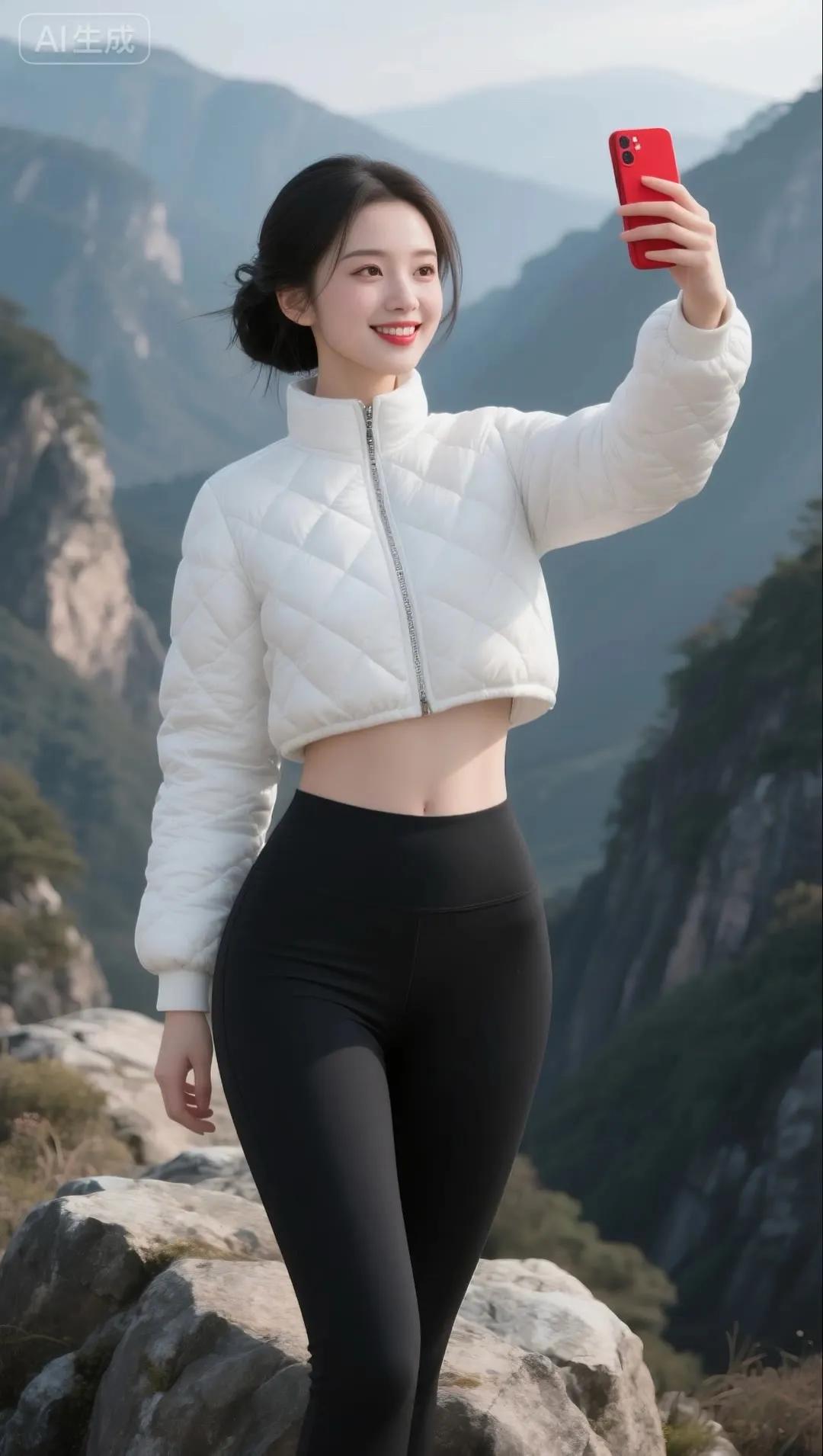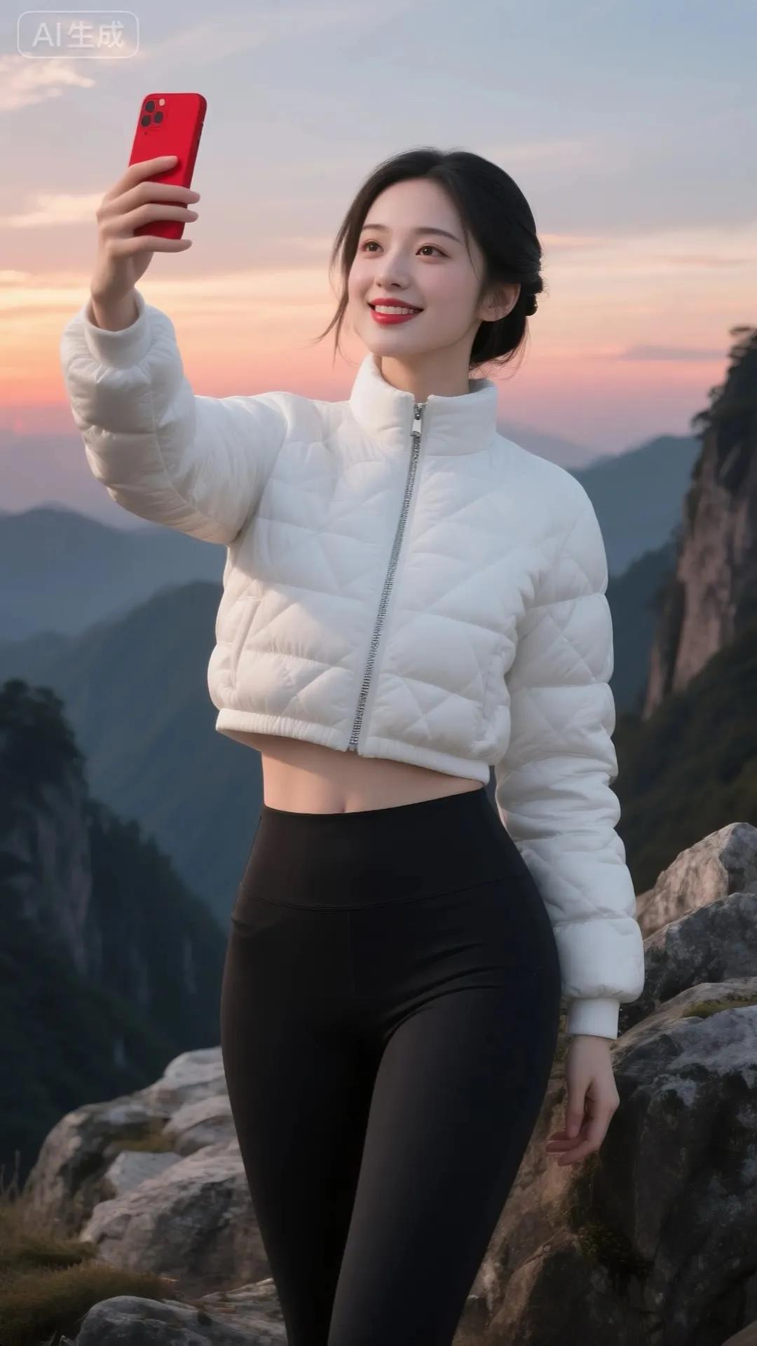 冬日雪景中的甜美自拍,红色羽绒服与白雪的完美搭配!🌨️📸