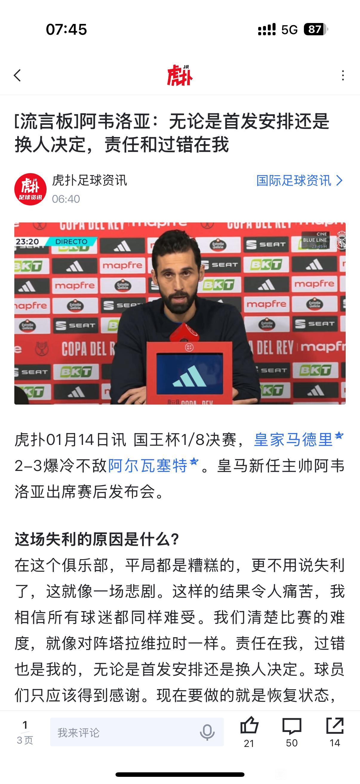 皇马新教练是真不行,第一场输球就说都怪他,首发和换人都是自己的错。 在世界级豪门得有自信,这样下去连续输球,连续道歉,谁还相信他呀。 皇马迫在眉睫找一位名帅!!不行就找穆里尼奥,齐达内吧。[可怜]