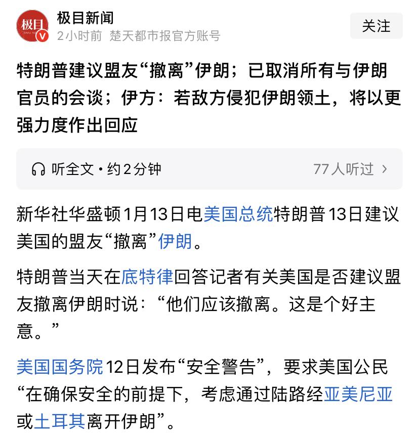 伊朗和美国都为战争做好了准备[灵光一闪] 伊朗这次事件本来不会引发成战争,原因就在于伊朗的抗议活动导致了数千人死伤,这让整个国际社会舆论哗然,连联合国都开始批评。在这种背景下,美国作为民主人权斗士就一定要表态,等于特朗普被推到了必须要惩罚伊朗政权的风口浪尖上,他没有退路。 再加上伊朗国内的民众,已经受不了哈梅内伊混乱的经济和外交政策,甚至公开呼吁特朗普介入。这就给美国打伊朗提供了很好的借口。 木叔认为军事打击虽然不可避免,但是很难想象哈梅内伊会在这次打击中失去政权。 原因就在于革命卫队依然保持忠诚。虽然伊朗会遭受打击,但军队不分裂问题就不大、因而哈梅内伊政权不会轻易垮掉。 不过打击和伊朗的民众抗议一样,会越来越严重削弱伊朗的经济基础和统治基础,量变到质变的过程,发生的会越来越快。中国要做好准备。