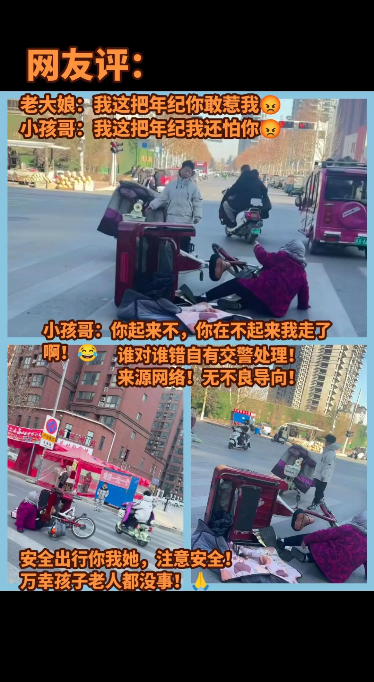 小孩哥骑着电动车,和骑着三轮的老大娘相遇了,老大娘随即倒地不起。小孩哥不慌不忙,让她赶紧起来,不起来自己就走了,老大娘还真就不起来。小孩哥转身开着自己的电动车,还真就走了,一去不回头那种,老大娘直接傻眼了。 小孩哥和老大娘这两个最不好惹的人相遇了,就这么戏剧化的开头,戏剧化的收尾。 小孩哥的电动车离老大娘的三轮还有一段距离呢,小孩哥也说了自己没碰到老大娘。可能是俩车快挨到一起的时候,老大娘急刹车或者拐弯没整好,自己倒了吧。 能在躺地上老大娘手里潇洒离去的只有小孩哥了吧!