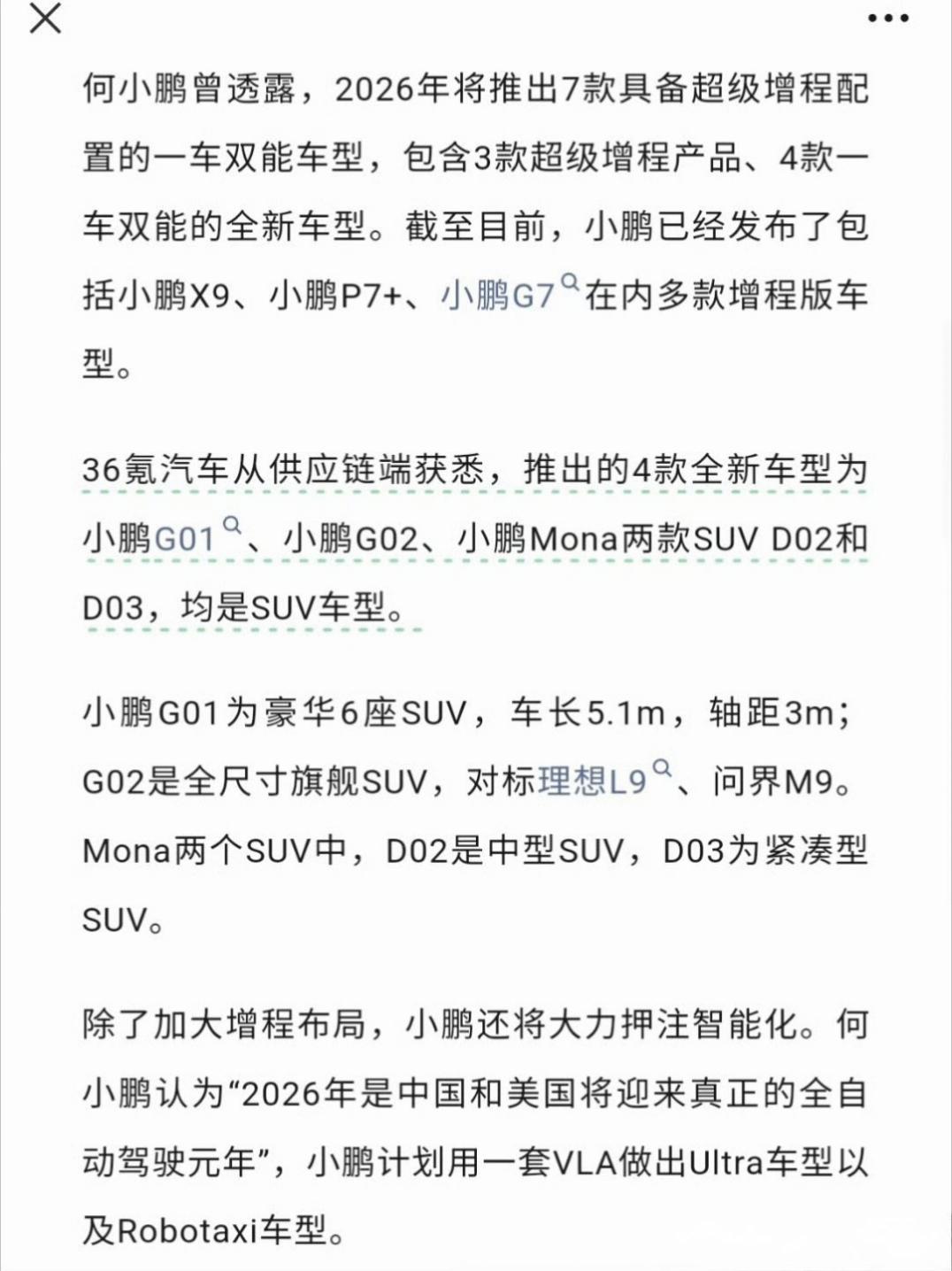 小鹏26年将冲击55万销量目标 2026年的小鹏,肯定比2025年会更好,我的信心来源于: 对于大部分车企,都是SUV卖的比轿车好,小鹏则是轿车销量比SUV高。而小鹏2026年规划了四款SUV,每一个都是瞄着爆款去的: ✔小鹏G01: 大六座SUV,5.1米车长,3米轴距,被誉为“广州库里南”。 ✔小鹏G02: 是全尺寸旗舰SUV,对标理想L9、问界M9,价格合适也会是爆品。 Mona一款车很成功了,两款SUV也来了,这两款车对应的市场区间量很大。 ✔MONA D02是中型SUV,10-20万区间爆款; ✔MONA D03为紧凑型SUV,目测15万左右。 2026年小鹏目标55万,我觉得能上50万就可以了,基本坐稳新能源前十强。【来自懂车帝车友圈】