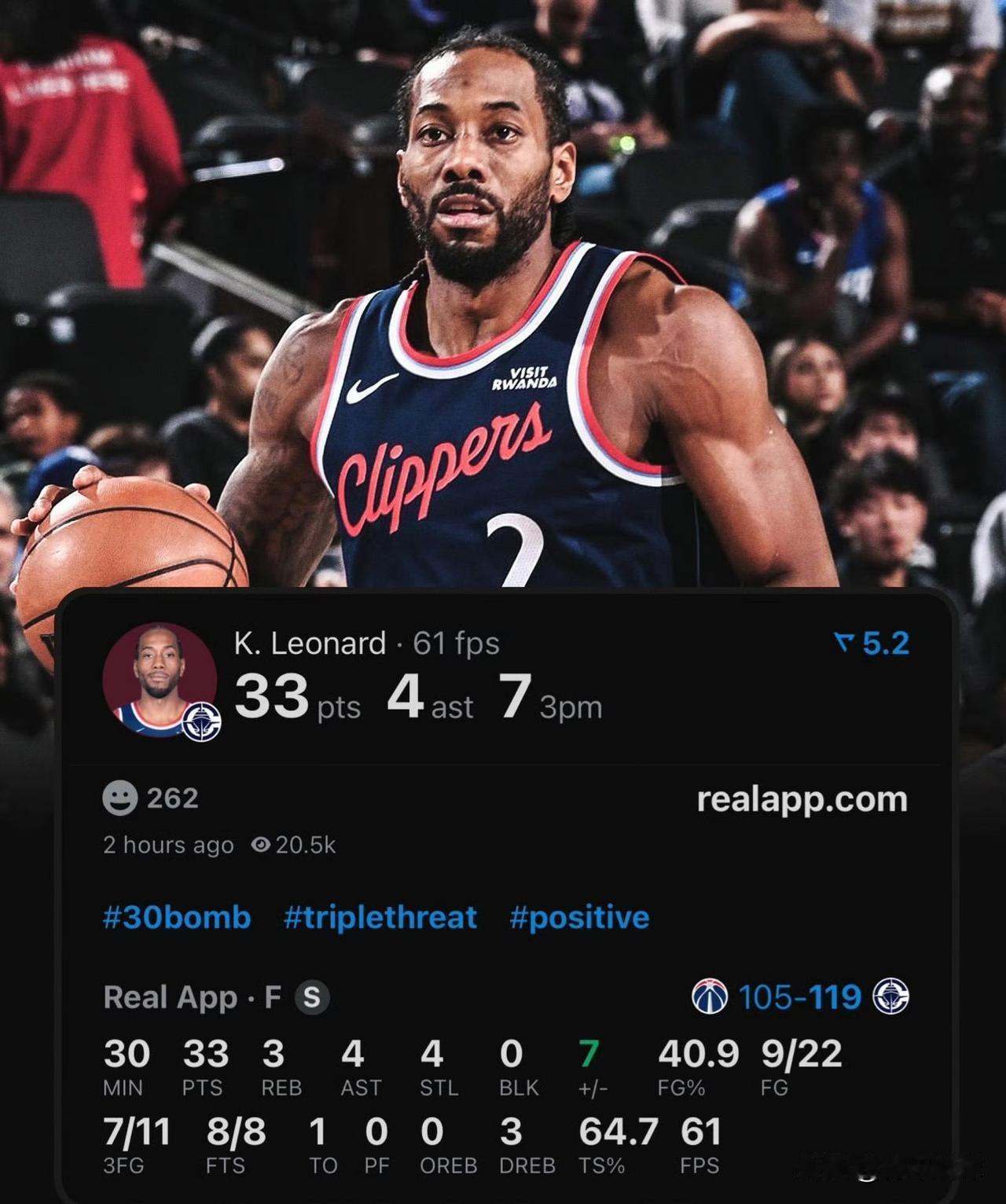 离谱!伦纳德三分球比两分球还准! 今天,主场作战的快船队战胜了奇才队,取得了一波四连胜,距离附加赛资格区仅差0.5个胜场。本场比赛,伦纳德再度打出了非常出色的表现,他全场得到33分3篮板4助攻,还送出了4个抢断,攻防两端都统治了比分。更让人瞠目结舌的是伦纳德的三分球,全场11投7中,命中率高达63.6%,下半场正是伦纳德用三分雨浇灭了奇才队疯狂反扑的嚣张气焰。值得一提的是,本场比赛伦纳德的中距离投篮11投仅2中,比他的三分球要差远了。