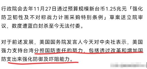 美国又改口了!在特朗普表示,“中方认为台湾是中国一部分,怎么处理是中方自己的事”之后,美国又出来表态了!1月15日,根据岛内媒体报道,美国国务院发言人表示,美国强力支持台湾分担“国防”责任的努力,包括通过改革和增加“国防”支出来强化防御及威慑能力。我们欢迎赖清德宣布台湾计划在今年将国防支出占GDP比重提高至3%以上,并在2030年提高到GDP的5%。 去年底美国务院悄悄删掉官网"不支持台独"表述,今年初又把"与台湾关系法"置顶。这种文字游戏不是第一次:2022年删了"台湾是中国一部分",被中方骂到一周后又补回去; 2025年把"非官方关系"改成"有意义的伙伴关系",现在直接给台当局算军费KPI。说白了,美国在一中原则上玩的是"分期付款式违约"——每次撕毁一点承诺,试探大陆底线。 更狠的是军事账。过去五年美国卖给台湾700亿美元武器,现在还要送"军援大礼包":2023年三次军售近10亿,把141架老掉牙的F-16A/B升级成V型,收了200亿新台币改装费; 派军事顾问驻台培训,说是"无偿援助",转头就要求台湾用"军事融资"还钱。岛内网友算过账:台当局计划2030年军费破5%,相当于每年多花2000亿新台币,足够建400所小学——这些钱最后都进了美国军火商的腰包。 最讽刺的是,美国一边喊着"保卫台湾",一边死活不承诺出兵。去年布林肯被CNN追问"会不会参战",连说了三次"确保台湾自卫";奥斯汀更直白:"解放军在台海的行动像排练攻击",但问到美军介入,立刻改口"提供防御手段"。 这种"口嗨式保护",连台湾时事评论员介文汲都看不下去:"美国改措辞是给大陆看的,台湾就是张牌,今天说支持明天就能卖。" 民进党当局却把美国的空头支票当圣旨。赖清德胜选后第一件事就是宣布加军费,跟着就和美国谈2290亿新台币的军购大单,包括过时的"海马斯"火箭弹和岸防导弹。 岛内舆论炸锅:去年台军被曝用过期15年的导弹训练,现在还要花冤枉钱买美国淘汰货。有台湾退役将领直言:"美军把台湾当乌克兰第二,想让我们打巷战到最后一人。" 美国打的什么算盘?明眼人都清楚:一方面靠军售吸血,2025年对台军售欠款高达142亿美元,比台湾一年军费还多;另一方面把台湾变成"豪猪",塞进亚太军事体系——2022年想拉台湾进"北约+",2025年推动参加多边军演,摆明了要把台海变成第二个俄乌战场。 但他们忘了最基本的事实:中美建交时白纸黑字写着"台湾是中国一部分",联大2758号决议早把台湾定位定死了。 中方的反制从来不含糊。去年美国通过110亿美元对台军售,外交部当天召见美大使;解放军环台军演常态化,无人机绕台次数比台军战机起飞次数还多。 正如王毅外长说的:"台湾问题是中美关系第一条红线,谁碰谁出血。"现在的台海,不是20年前的台海——当美国还在用"切香肠"战术玩火,14亿中国人捍卫主权的决心,早已凝成钢铁长城。 从特朗普"说实话"到国务院"递刀子",美国的台海政策从来没变过:用台湾的血,养自己的军火商,耗中国的发展时间。 但历史大势不会骗人:1979年中美建交时,美国承认一个中国;2026年的今天,全球182个国家同中国建交——这就是"台湾是中国一部分"最硬的道理。民进党当局与其给美国数钱,不如听听岛内民众的呼声:"别当美国人的炮灰,和平统一才是出路。"