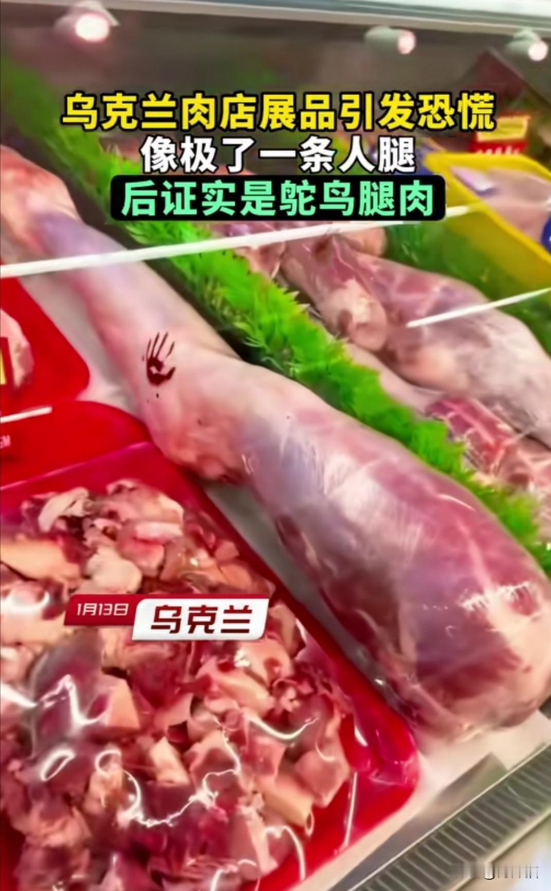 这到底是人腿还是鸵鸟腿,我真是傻傻分不清了。近期乌克兰的鸵鸟肉事件实在太过离谱。有人在菜市场竟发现售卖的肉形似人腿,这可把众人吓得够呛,一时间各种猜测纷至沓来,恐慌情绪也随之蔓延。大家心里必然都犯起了嘀咕,倘若真是人腿,那可就太惊悚了。 好在后来乌克兰政府出面证实,这其实是鸵鸟肉。不过这鸵鸟肉长得着实具有迷惑性,想必卖肉的摊主也挺冤枉,本是正常售卖鸵鸟肉,却引发了如此大的风波。 这也给大家提了个醒,日后在菜市场瞧见奇奇怪怪的肉,先别急着自己吓自己,说不定背后藏着个让人哭笑不得的真相呢。 大家觉得像人腿还是鸵鸟腿呢? 图片来源于网络,侵权删。