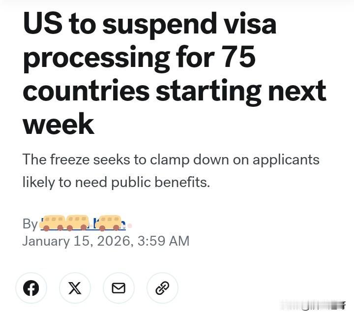 川普宣布将冻结对75个国家的签证办理,将于1月21日开始。涉及的国家有索马里、俄罗斯、阿富汗、巴西、伊朗、伊拉克、埃及、尼日利亚、泰国、也门、柬埔寨、缅甸、古巴、白俄罗斯、亚美尼亚、阿塞拜疆、孟加拉等,75个,太多了,就不一一细说了。 川普给出的理由是这些国家的人占了太多美国人的福利。 美国签证