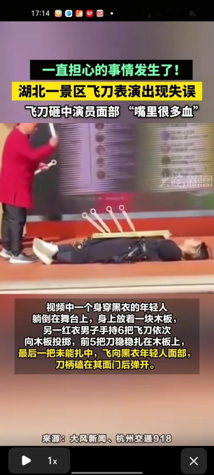 1月13日,湖北武汉。网友发视频称,木兰不夜城进行飞刀表演,飞刀操作失误砸在表演者的脸上。视频中可以看到,一位黑衣男子躺在舞台上,身上放着一块木板,另一位红衣男子手持六把飞刀依次向木板投掷,前五把刀稳稳扎在木板上,最后一把未能扎中,飞向黑衣男子脸部,刀柄磕在其面门后弹开。 受伤杂技演员回应称,当时是同事一点小失误,飞刀碰了下嘴皮,只受了皮外伤,用水洗了一下,第二天就能正常演出。 飞刀起落间是技艺的淬炼,更是性命相托的信任。这场小失误虽仅造成皮外伤、最终虚惊一场,却也敲响了安全警钟,杂技艺术以惊险见张力,以精准立根基,容不得半分侥幸。每一次抛投都关乎同伴安危,每一处细节都连着舞台生命线,只有将严谨刻进日常训练、把防护落到每个环节,才能让惊险表演既有视觉震撼,更有安全兜底,让观众看得安心,让表演者演得放心。