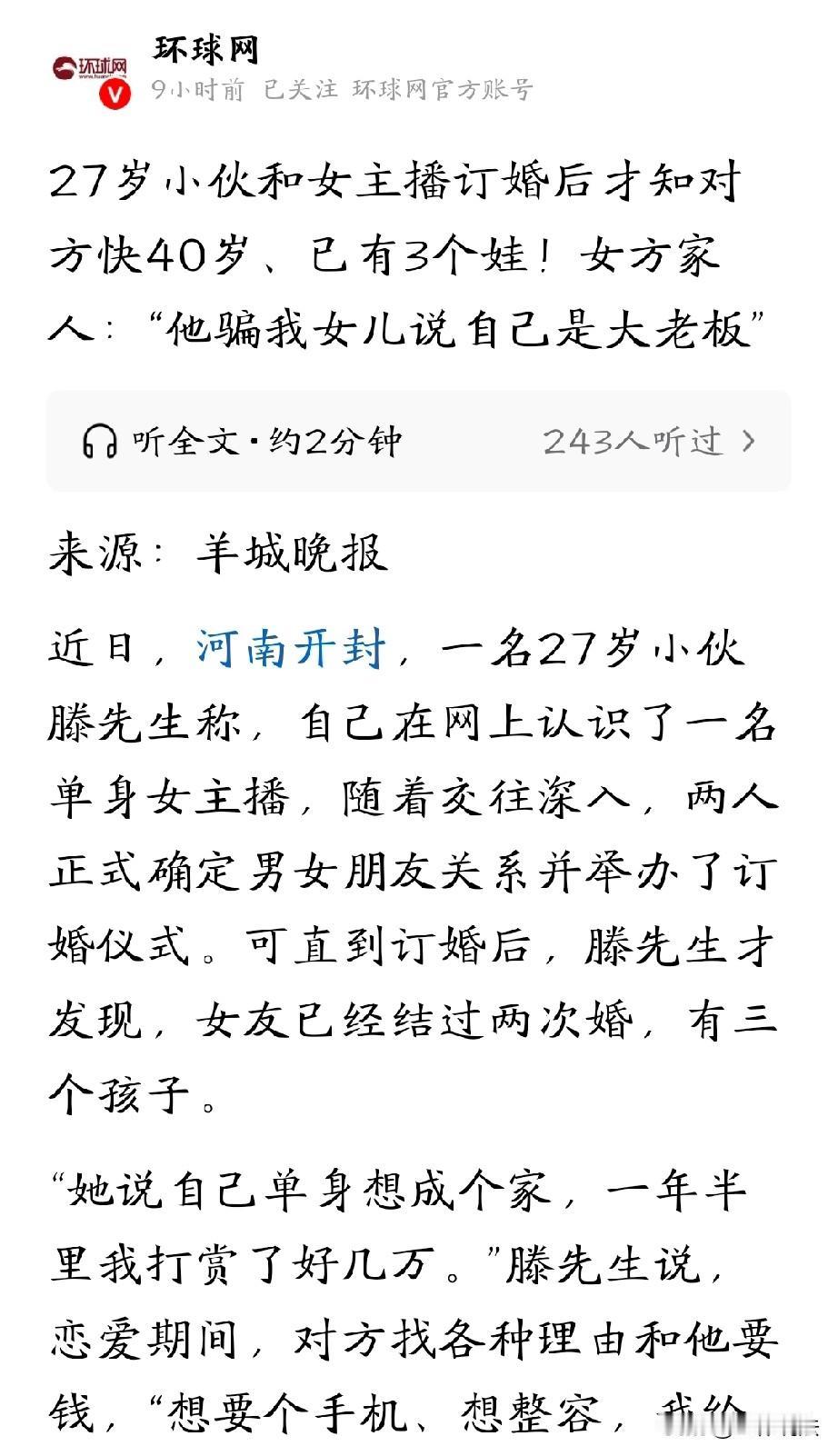 河南开封,27岁男子认识了一名女主播,女子自称单身,还说要找个靠谱的人结婚,男子很是心动,为了把她娶回家,便给他疯狂打赏好几万。很快,两人线下见面并订婚,男子给了女方11万彩礼,并约定马上结婚。谁知,当他满心欢喜筹备婚礼时,却发现女子已经39岁了,不但离过婚,还有3个孩子。掏心掏肺对她好,砸进去三四十万,结果被骗的团团转,男子咽不下这口气,找到女子要求还钱。谁知,女方却给出了完全不同的说法。 27岁的滕先生一直单身,看着同龄人成双入对,他很是羡慕。 2023年,他在网上偶然认识了女主播燕儿,燕儿在直播里称自己单身,想找个老实靠谱的人,结婚过日子。 看着屏幕里能说会道、年轻漂亮的燕儿,滕先生越来越喜欢,刚好他也有结婚的想法,要是能把燕儿追到手,那也太有面了。 为了抱得美人归,滕先生经常去燕儿的直播间刷礼物,一个没忍住,便打赏了好几万。 他的大手笔也成功引起了燕儿的注意,两人不仅加了联系方式,甚至约着,在上海见了面。 一见面,滕先生更惊喜了,燕儿本人比直播间里看着还要好看迷人,让他彻底沦陷,铁了心要把她娶进家门。 线下见面之后,两人的感情更进一步了,很快就确定了恋爱关系。 恋爱期间,燕儿总是找各种理由跟滕先生要钱,今天说家里有点急事,明天说想买个包包。 滕先生一心想着和她好好过日子,便毫无底线的宠着惯着,只要她开口,所有要求都满足,所以,前前后后又给了燕儿8万多。 相处了半年,藤先生觉得感情挺稳定了,就举办了订婚仪式。 订婚时,按照当地习俗,滕先生给了女方见面礼和彩礼,一共11万元,双方约定好,10月1日就结婚。 滕先生满心欢喜地筹备着婚礼,可谁能想到,这看似美好的一切,背后却藏着巨大的谎言。 过年的时候,滕先生提着大大小小的礼盒去燕儿家吃饭,正吃着,突然有个小孩跑过来,直接喊燕儿妈。 滕先生当时就愣住了,一种不祥的预感涌上心头。 他赶紧去村里打听,这一打听可不得了,原来燕儿不仅结过两次婚,还有三个孩子,而且,她根本不是二十来岁,实际上已经39岁了。 这些爆炸性的信息对他来说简直是五雷轰顶,订婚前,他可是一点都不知道。 更让他崩溃的是,燕儿根本不老实,一直在网上给其他大哥发信息索要礼物,还和别人搞暧昧。 自己掏心掏肺的对她好,结果却被骗得团团转,藤先生怒了,准备找燕儿问个明白,谁知,她竟玩起了消失。 这下,滕先生彻底急了,被骗了感情不要紧,三四十万打了水漂,这几乎是自己所有的积蓄,这口气他咽不下。 于是,他找到燕儿家属,想要把钱要回来。 燕儿父亲直言,自己女儿确实34岁,之前离过婚,也有孩子,但他一口咬定,这些情况藤先生都是知情的 而且他指出,是滕先生骗了自己女儿在先,他说自己是个老板,有钱得很,还在市里买了房子。 结果,结婚的时候他们才发现,他啥都没有,这不是典型的骗婚吗? 《民法典》第148条规定:一方以欺诈手段,使对方在违背真实意思的情况下实施的民事法律行为,受欺诈方有权请求人民法院或者仲裁机构予以撤销。 女主播燕儿虚构自己的年龄、婚姻史、子女情况,以结婚为幌子骗取财物的行为,本质是借婚姻索取财物。 燕儿通过欺诈手段,使滕先生陷入错误认识,基于结婚目的实施了打赏、转账、支付彩礼等民事行为,滕先生作为受欺诈方,依法享有撤销权。 恋爱期间,藤先生给出的8万余元的大额转账、直播间高额打赏等,均是建立在结婚的虚假合意基础上,属于可撤销的赠与行为。 而且, 双方未办理结婚登记,且滕先生对燕儿的真实情况事先不知情,无过错。 燕儿在订婚后失联,无共同生活的真实意愿,符合彩礼全额返还的法定情形,所以滕先生有权要求返还。 好在经过协商,目前女方已经退还了9万元彩礼。