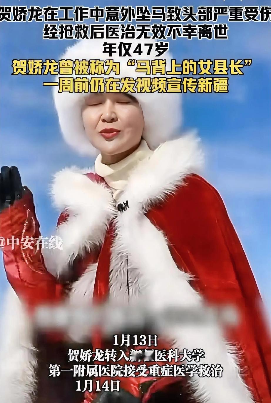新疆的朋友跟我说,骑马穿大红大紫是忌讳,马容易受惊,容易出事。 贺娇龙是老手了,她能不懂? 之前摔断三根肋骨,摔出胸腔积液,这都是血淋淋的教训。 可她偏要穿那身红袍。 说白了,穿黑穿灰没人看,没人看就没流量,家乡的那些农货就得烂在地里。 她是在拿命博眼球,跟冷冰冰的算法换销量。 哪怕知道这是在刀尖上跳舞,为了那点曝光量,她也认了。 这一路看着消息反反复复,心里一直悬着,想着她那么硬气肯定能挺过去。 结果人还是走了。 这哪里是网红作秀,这分明就是拿命在填补偏远地区的流量鸿沟。 那抹红色消失了,以后谁还愿意为了那几斤苹果去拼命呢?红衣骑马美人 贺娇龙 贺娇龙坠马