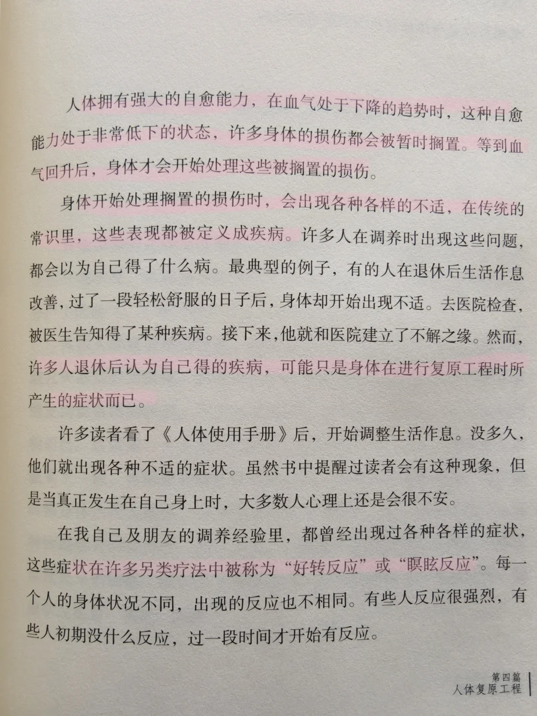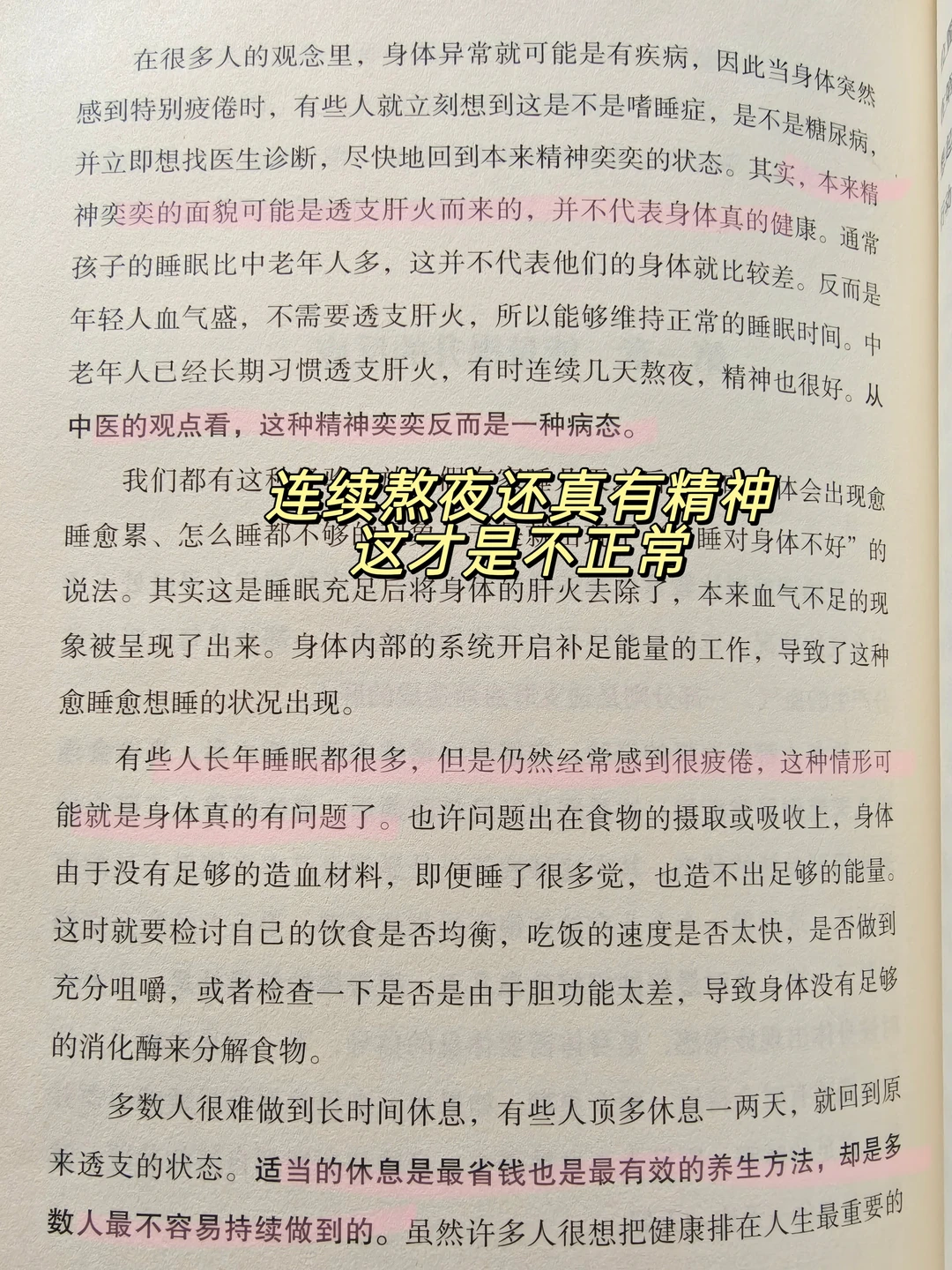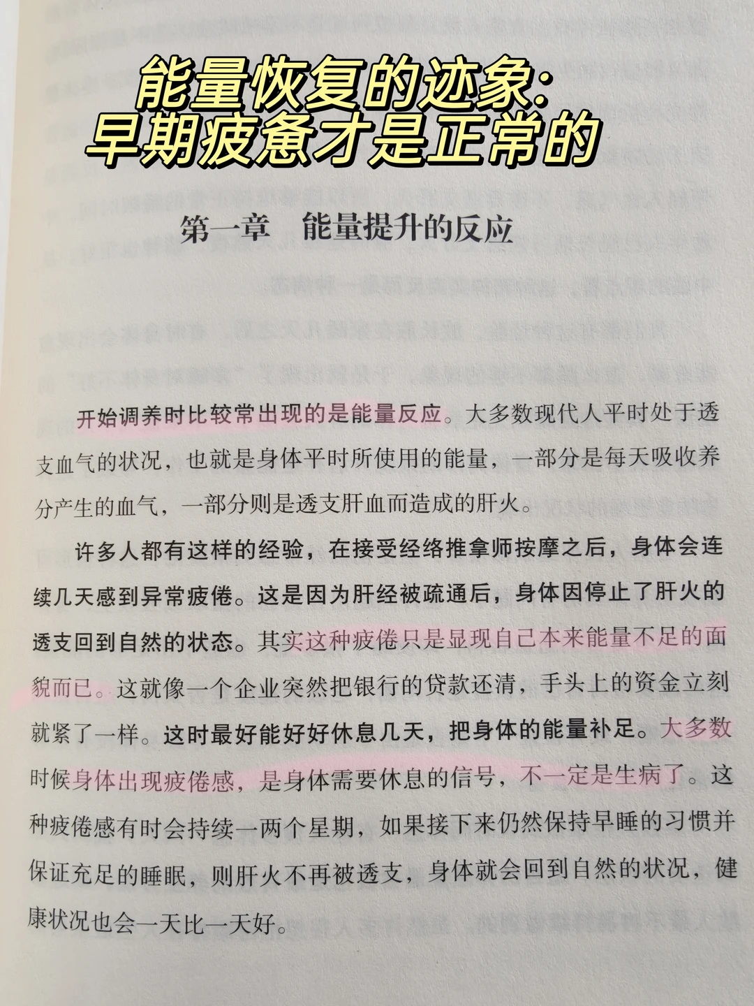 大家有没有跟我一样,熬夜后身体垮了,开始早睡,但第二天并没有如预想那样精神满满,反而比之前更累了; 类似还有休息一段时间,精神更差了。 · 其实这些都是能量开始恢复的正常迹象。我们之前熬夜是在透支肝火,提前透支体内的能量。开始早睡后,身体每天产生的气血,一时还无法弥补原来仰赖透支的能量缺口,这样,人在初期反而会感觉精神更差,这种疲倦只是显现自己本来能量不足的面貌而已。 · 需要注意的是,连续熬夜后还很有精神,这反而是一种病态。同时,如果睡眠很多,还是经常感到疲倦,这种情形可能是身体真的有问题了。 · 我们人体拥有强大的自愈能力,在气血处在下降的趋势时,这种自愈能力处于非常低下的状态,许多身体的损伤都会被暂时搁置。等到气血回升后,身体才会开始处理这些被搁置的损伤。 · 身体开始处理搁置的损伤时,会出现各种各样的不适,在传统的常识里,这些表现都被定义成疾病。许多人在调养时出现这些问题,都会以为自己得了什么病。最典型的例子,有的人在退休后生活作息改善,过了一段轻松舒服的日子后,身体却开始出现不适。去医院检查,被医生告知得了某种疾病。接下来他就和医院建立了不解之缘。然而,许多人退休后认为自己得的疾病,可能只是身体在进行复原工程时所产生的症状而已。