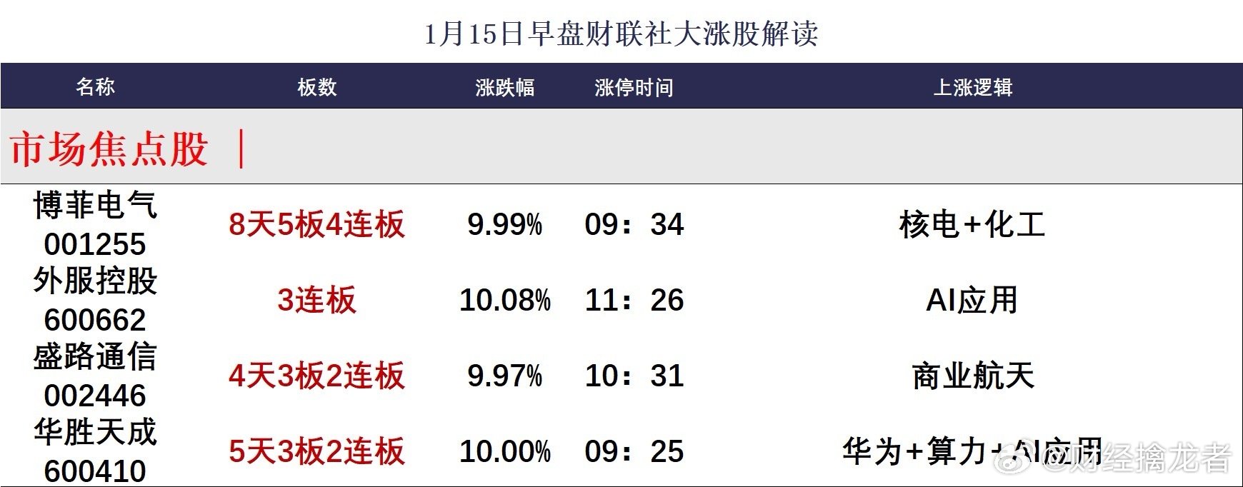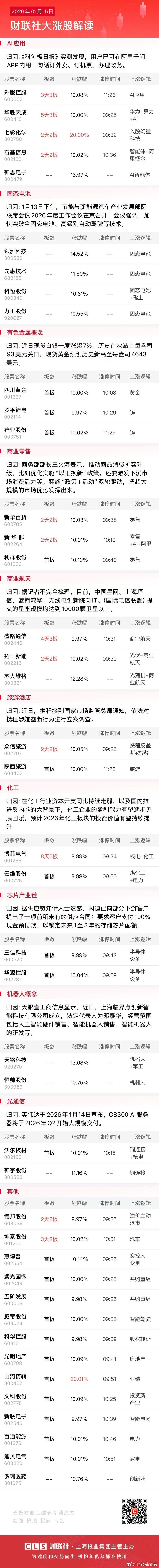 【1月15日午间涨停分析】财联社1月15日电,今日午盘全市场共32股涨停,连板股总数13只,20股封板未遂,封板率为61%(不含ST股、退市股)。焦点股方面,化工股博菲电气4连板,成为市场高度板。AI应用概念股外服控股3连板,华胜天成5天3板。商业航天概念股盛路通信上演地天板,走出4天3板。今日看盘上证指数