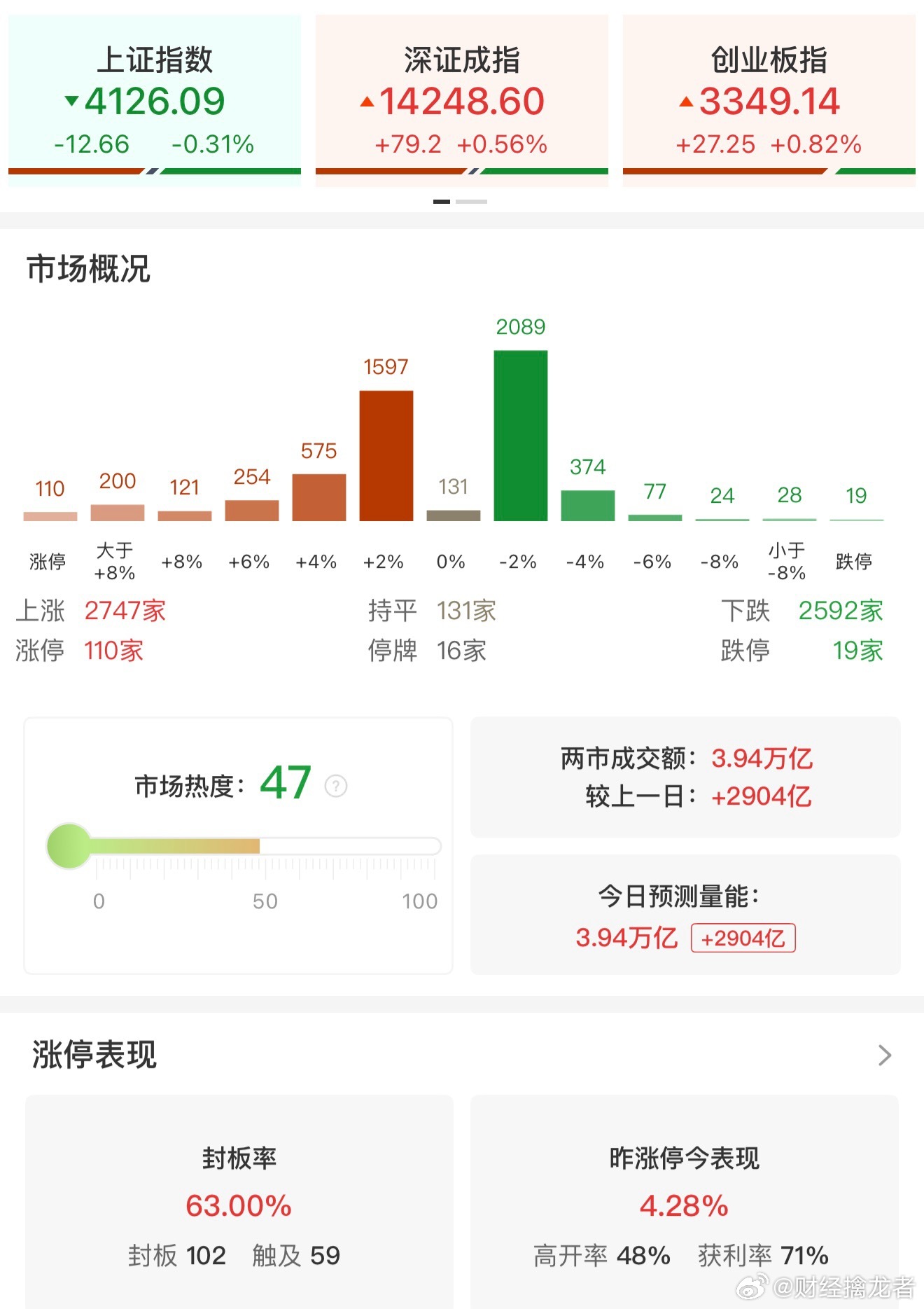 【收评:沪指冲高回落跌0.31% 两市成交额近4万亿】市场冲高回落,沪指午后快速翻绿,此前一度涨超1%。沪深两市成交额3.94万亿,较上一个交易日放量2904亿,连续第3个交易日突破3.5万亿。盘面上,市场热点快速轮动,全市场超2700只个股上涨。从板块来看,AI应用概念爆发,二十余只成分股涨停,利欧股份9天6板,省广集团4连板,新华网、人民网、三江购物3连板,壹网壹创3天2板。算力硬件概念午后拉升,光迅科技涨停创新高。半导体板块走高,亚翔集成涨停创历史新高。商业航天概念局部活跃,海格通信3连板创新高,大唐电信、佳缘科技等多股涨停。下跌方面,能源金属、保险、银行等板块跌幅居前。其中锂矿概念下挫,国城矿业触及跌停。截至收盘,沪指跌0.31%,深成指涨0.56%,创业板指涨0.82%。今日看盘今日看盘上证指数