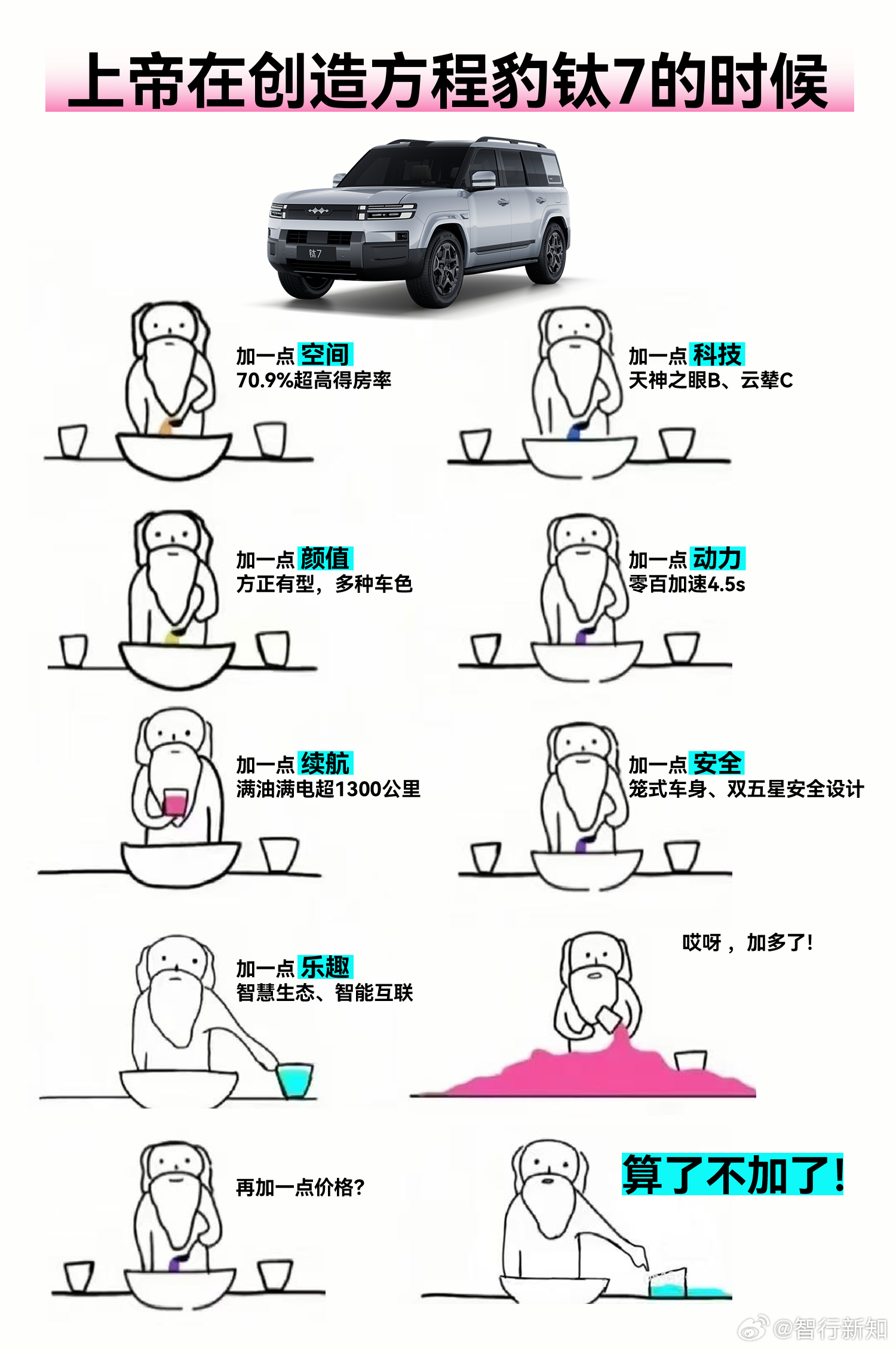 方程豹全家桶里豹5是硬派越野天花板豹8是未来感爆棚的机甲猛兽🤖钛3是个性大玩具而钛7……好像真的没什么“人设”??🤷♀️但我还是买了!因为钛7虽然不是单项冠军,却是六边形战士——要豪华有质感,要空间够舒展要智能够流畅,要续航够扎实要家用够舒适,要出门能轻度撒野家用无敌💯钛7车主们,你们同意不?