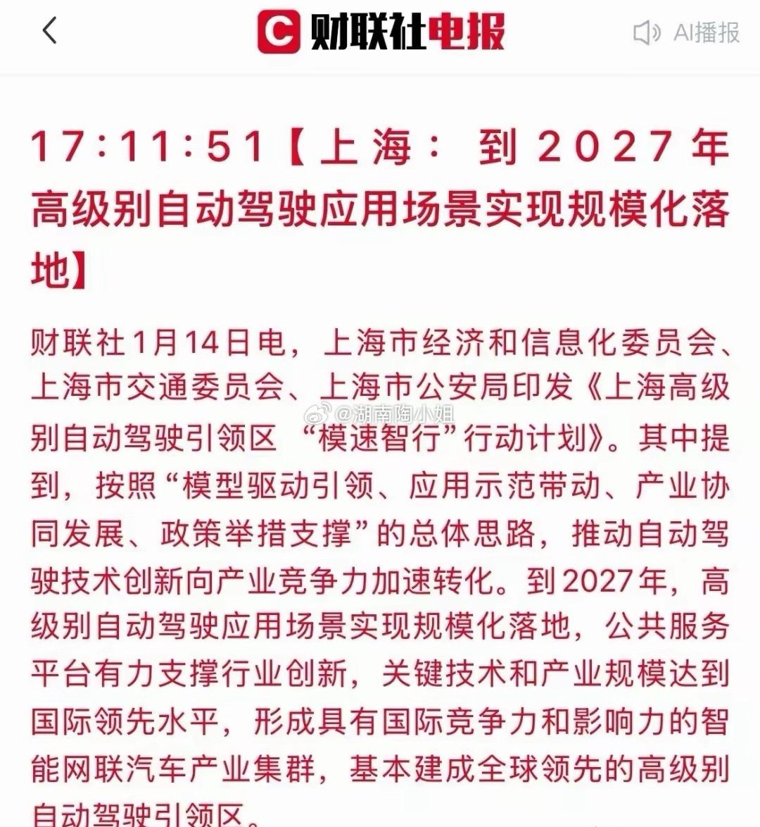 大利好!重大利好!事关无人驾驶 刚刚上海放大招了!上海:到2027年高级别自动驾驶应用场景实现规模化落地。首先无人驾驶产业链会极大受益 其次上海此举旨在抢占科技制高点 毕竟无人驾驶是先进技术的集大成者 要实现规模化落地就需要加大城市基建升级 科技投入。所以持有自动驾驶方向的朋友坐稳扶好了 不出意外的话明天这个方向要起飞了 毕竟现在4万亿的量能 但凡有个题材有利好就能飞起来。