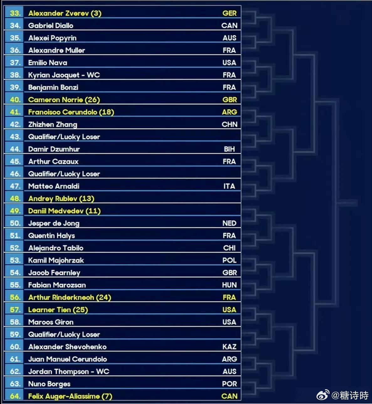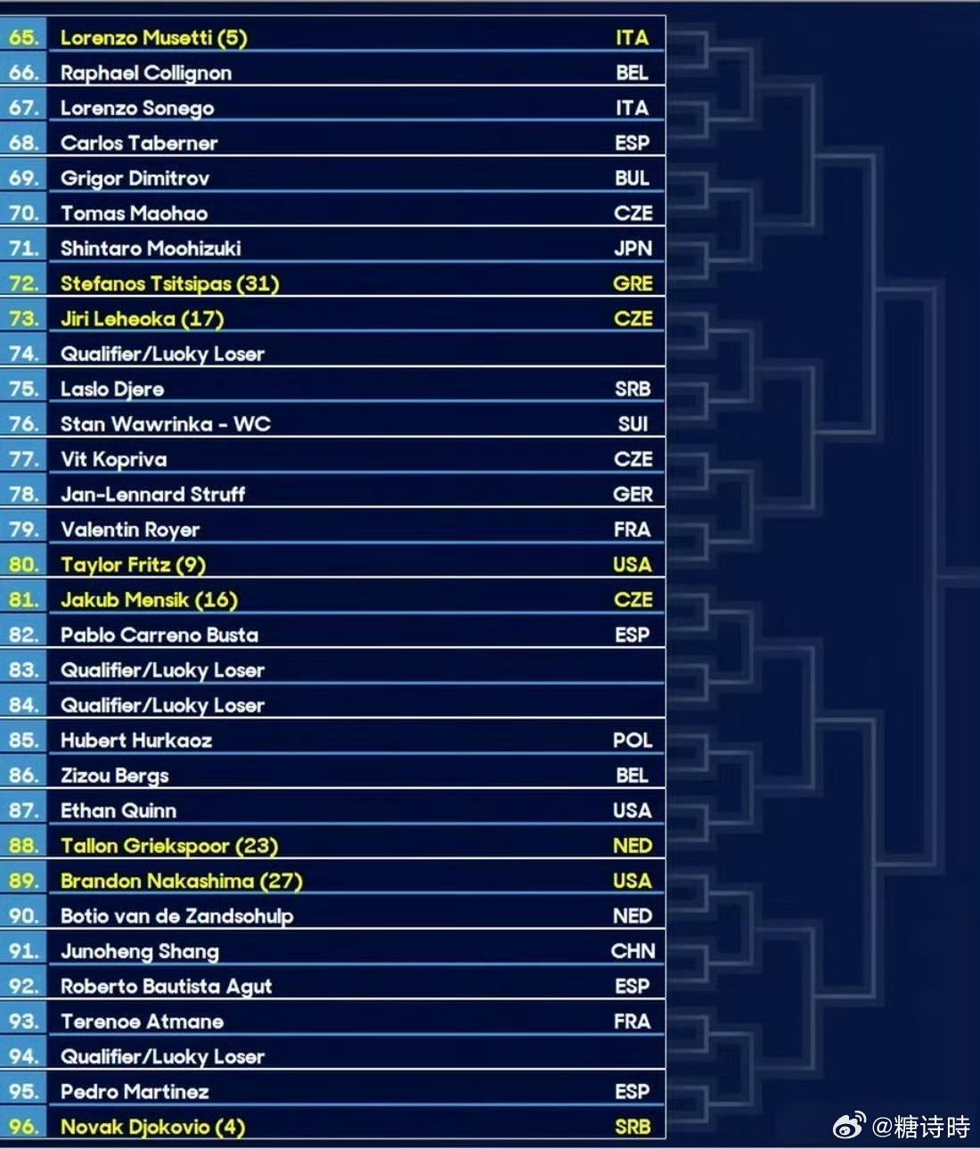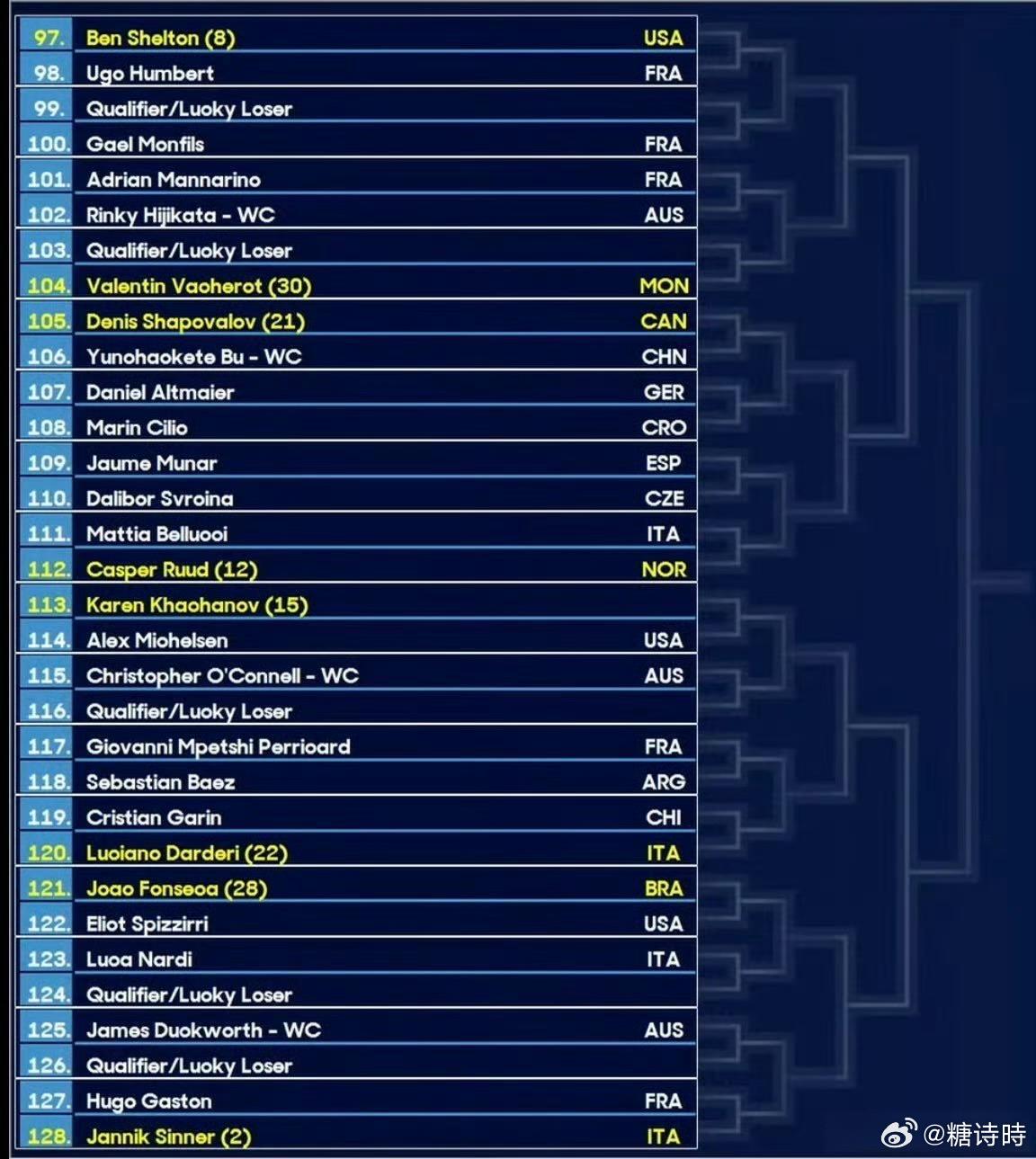 男单正赛前八种子对位👇阿尔卡拉斯 - 德米纳尔兹维列夫 - 阿利亚西姆穆塞蒂 - 德约科维奇谢尔顿 - 辛纳男单正赛中国大陆球员首轮对阵👇张之臻 vs F·塞伦德罗[18]商竣程 vs 包蒂斯塔·阿古特布云朝克特 vs 沙波瓦洛夫[21]吴易昺v待定 |