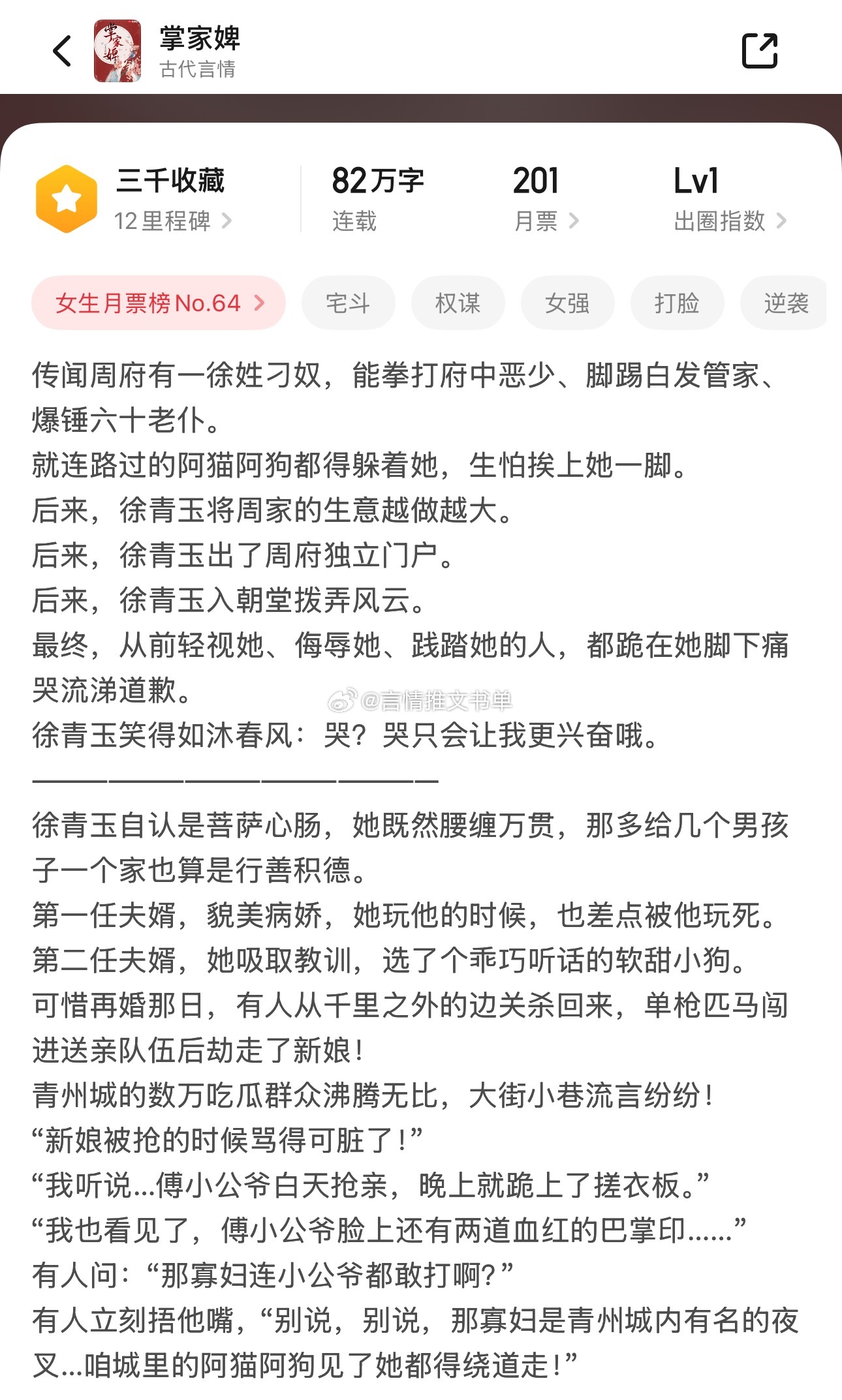 微博年度待改编IP评选pick你心中的改编潜力王掌家婢值得改编 熬夜刷完《掌家婢》,这本宅斗文我直接封神!🔥月下兰舟你是我的神!最近挖到一本超冷门但绝上头的古言——《掌家婢》!作者月下兰舟真是宝藏,文笔细腻到像在剥一颗水煮蛋,一层层揭开宅门里的暗涌,看得我头皮发麻又舍不得眨眼!女主不是什么穿越开挂的千金,而是个生在下人堆里的“家生婢”。从浆洗房到深宅核心,她每一步都像在刀尖上跳舞,靠的是一双看透人心的眼和一副硬骨头。没有金手指,没有狗血爱情救援,只有女子在封建夹缝里挣命的清醒与狠劲。作者写宅斗写得像谍战,每个眼神交锋都暗藏玄机,我半夜缩被窝里看得直掐大腿——“这才是真实的人性博弈啊!”配角也全员立体,伪善主母、笑面虎姨娘、野心丫鬟……甚至厨房婆子都有故事线。月下兰舟太会埋线,前期你以为的闲笔,后期全是回旋镖,刀刀扎心!感情线更是绝,男主出现得晚却存在感拉满,和女主的张力像淬火的铁,冷硬里迸着星火,成年人的爱情果然都在细节里拉丝!如果你是《知否》式宅斗爱好者、厌烦了爽文套路、追求文字质感与逻辑自洽——直接冲这本!关键词:古言宅斗 清醒女主 权谋下人 女性成长 推文心路:这本书最戳我的是“真实感”。女主不是靠脸或运气逆袭,而是靠观察、学习和破局智慧破阶,像极了现代职场生存图鉴。