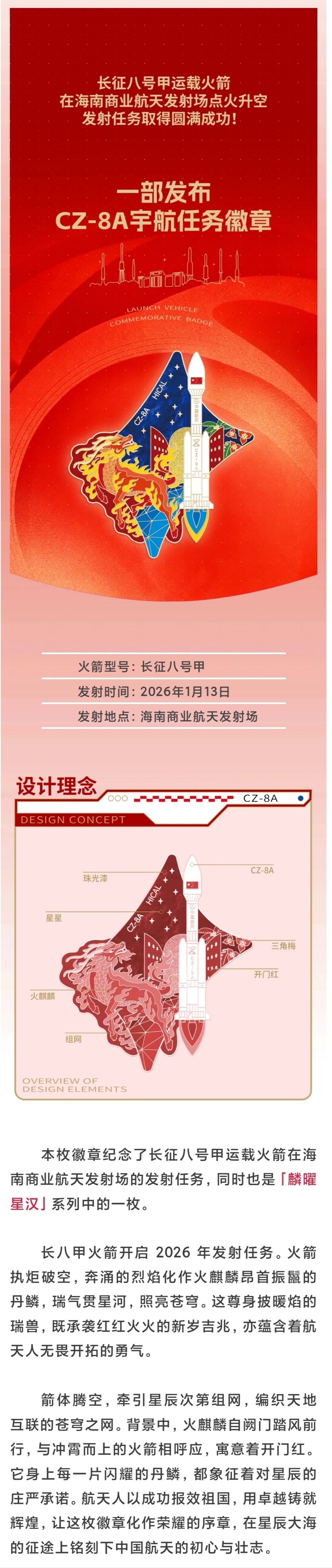 2026年1月13日23时25分海南商业航天发射场1号工位长征八号甲遥七运载火箭成功发射卫星互联网低轨18组卫星大红屏和任务徽章卫星互联网低轨18组卫星由航天科技集团有限公司五院抓总研制长八甲火箭由航天科技集团一院抓总研制,是我国自主研制的两级半状态液体运载火箭,芯一级为直径3.35米的液氧煤油模块,芯二级为直径3.35米的氢氧模块,捆绑2个液体助推器,采用5.2米直径整流罩。全箭总长约50.5米,起飞重量约371吨,起飞推力约480吨,可满足地球中低轨道星座组网发射需求在本次任务中,火箭团队通过并行工作、精细化管理和精准调度,进一步优化发射测试流程,一号发射工位占位时间大幅缩短至5天,这是海南商业航天发射场高密度发射能力的又一次重要飞跃。目前,长八甲火箭的发射测试流程已压缩至18天,后续火箭团队将持续推动实现“7天发射、7天恢复”目标。2025年,长八甲火箭成功首飞,实现“六战六捷”2026年,长八系列火箭将迎来更高密度的发射任务❶2026年度中国航天第2次发射(2次成功)❷长征八号甲运载火箭第7次发射(7次成功)❸长征八号系列运载火箭第11次发射(11次成功)❹长征系列运载火箭第625次发射(608次成功)❺海南商业航天发射场第11次发射(11次成功)❻中国航天第735次发射(697次成功)