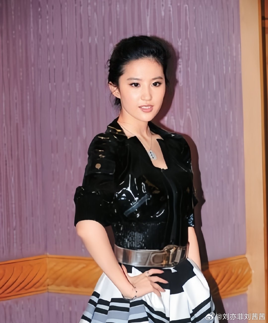 刘亦菲最新室内活动造型曝光,复古摩登风惊艳全场,这穿搭你给打几分?刘亦菲此次现身室内活动,背景是紫调纹理墙面搭配木质装饰线条,再加上艺术挂画的点缀,整体环境既精致又复古,仿佛置身于时尚发布会或媒体专访现场。穿搭上,她更是大胆尝试,上身选择黑色亮面漆皮短款上衣,酷飒的摩登质感扑面而来,收腰设计更是凸显出她纤细的腰线。下身则搭配黑白灰条纹蓬蓬半裙,柔美的裙摆与硬朗的上衣形成鲜明对比,风格碰撞出别样的火花。金属宽腰带与简约圆形吊坠项链的加入,更是为整体造型增添了层次感与精致度。形象气质方面,刘亦菲也是毫不逊色,黑发高束,露出清晰的五官与修长脖颈,眼神清冷又带着一丝灵动,既有都市女性的干练摩登,又保留着独有的清冷仙气,甜酷风格的混搭让她在镜头前展现出别样的时尚张力。刘亦菲此次的复古摩登风造型,真是让人眼前一亮,甜酷风格的混搭也展现出了她独特的时尚品味。刘亦菲刘亦菲