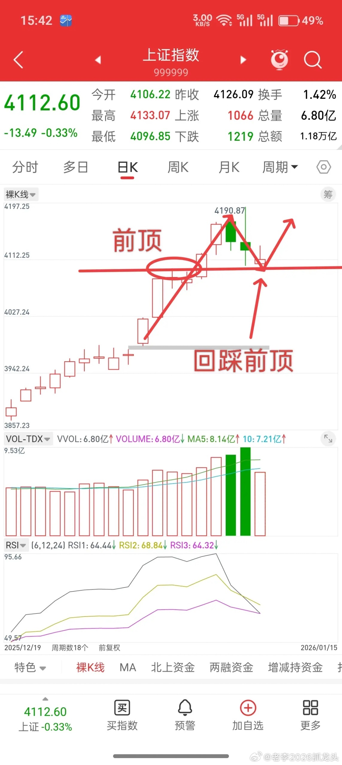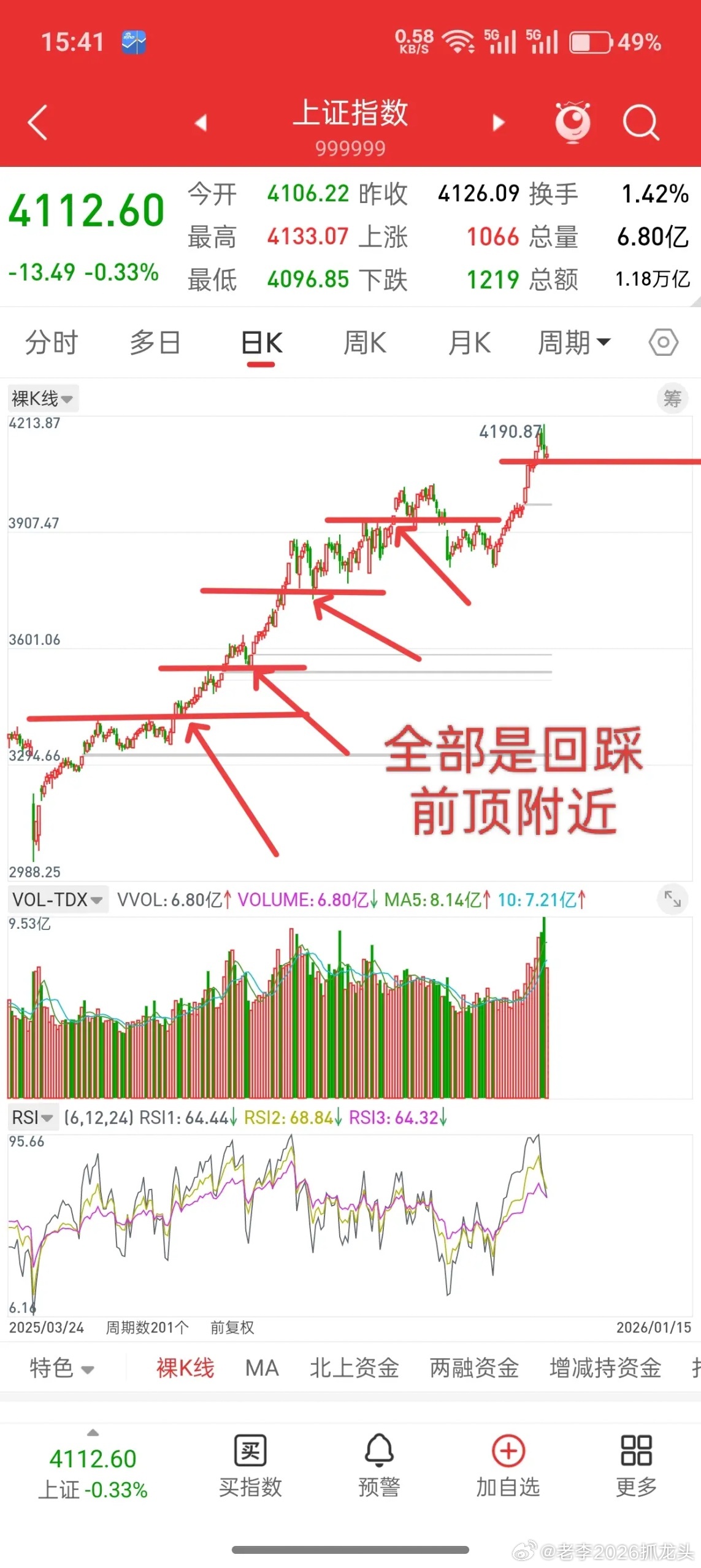 A股,今日触及关键位置,接下来或许历史总是惊人的相似!相似之处在哪,在回踩前顶附近!可以看下前期大盘每次连续拉升的时候,后面回踩的位置是不是都是前顶附近。前几天大盘一直拉升,我提示洗盘风险,当时指数在4150以上的时候,就已经提示洗盘先看4098附近,今天最低点4096。这不是巧合,而是前顶附近一般是主力成本所在,无论指数还是个股,突破前顶,加速拉升,后面回踩的位置很讲究,大概率是到前顶附近,然后再拉升。因此,打点就很清晰,接下来就看反弹力度如何了。