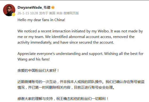 韦德称账号被盗今日发文回应近期账号异常:亲爱的中国粉丝们大家好!近期微博账号的一次互动,并非我本人或我的团队操作。我们已确认存在账号被盗情况,并已第一时间删除相关内容,目前正进行账号安全处理。