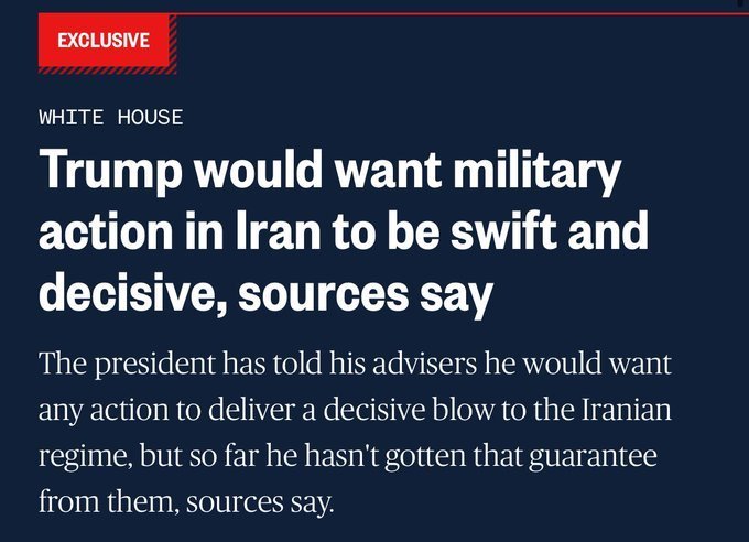 消息人士:美国总统特朗普已告知其国家安全团队,不管采取什么具体方式,他希望美国对伊朗的军事行动,可以对伊朗政权进行“迅速而果断的打击”,而不是引发一场持续数周或数月的持久战争。- NBC