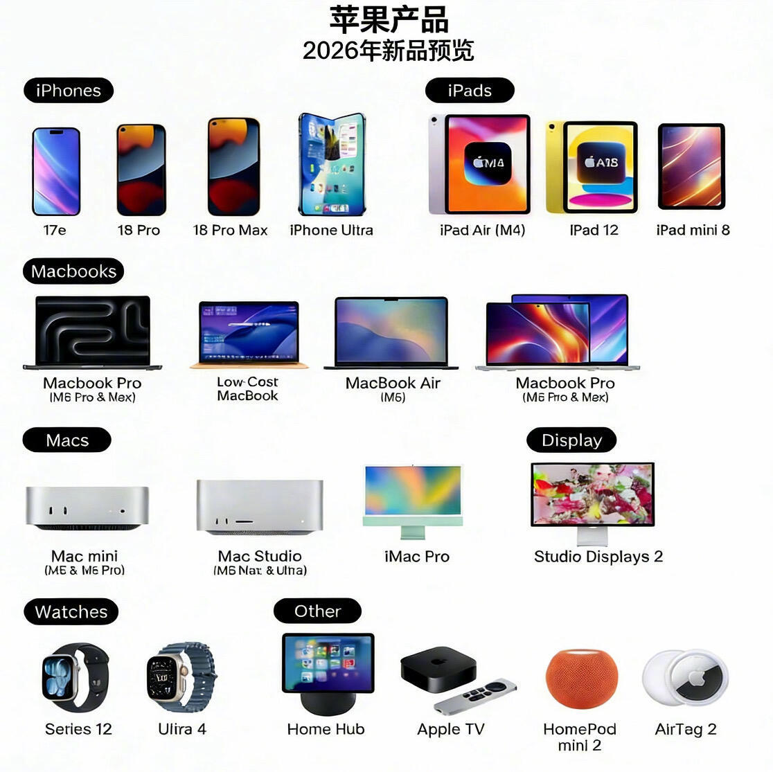 苹果🍎2026新品路线图📅果粉们可以提前规划钱包了👛从iPhone到Mac再到穿戴设备全部重磅升级🔥📱iPhone 阵营:▪️iPhone 17e(入门新选择)▪️iPhone 18 Pro / Pro Max(这次多大升级?)▪️iPhone Ultra(顶级旗舰登场!)💻iPad 系列:▪️iPad Air 搭载 M4 芯片▪️iPad 12 & iPad mini 8 同步更新🖥️Mac 全系换代:▪️MacBook Pro 上 M6 Pro/Max▪️MacBook Air 用上 M5▪️Mac mini / Studio 也迎 M5 系升级▪️iMac Pro 终于回归!⌚️穿戴与生态:▪️Apple Watch Series 12 & Ultra 4▪️Home Hub 智能家庭中枢▪️Apple TV + HomePod mini 2▪️AirTag 2 防丢神器升级总结:2026可能是苹果“全家桶”换代大年✨你的钱包准备好了吗?你最期待的是哪个?