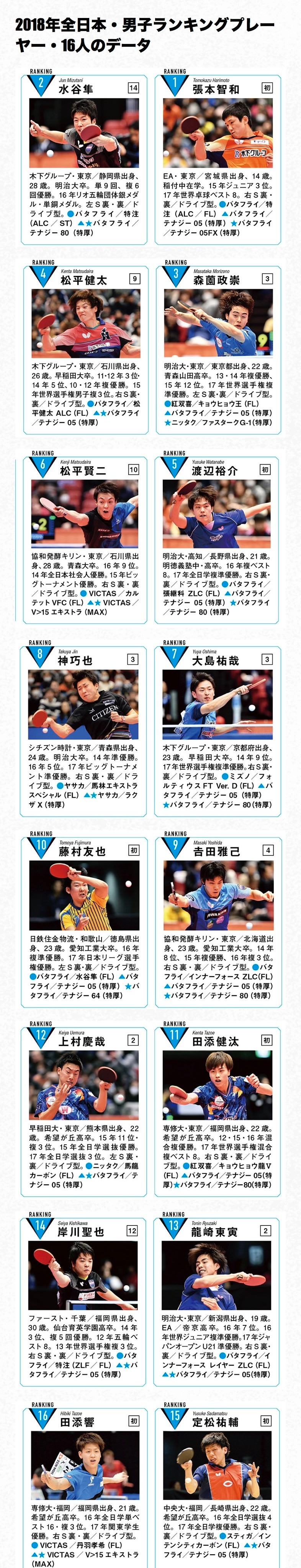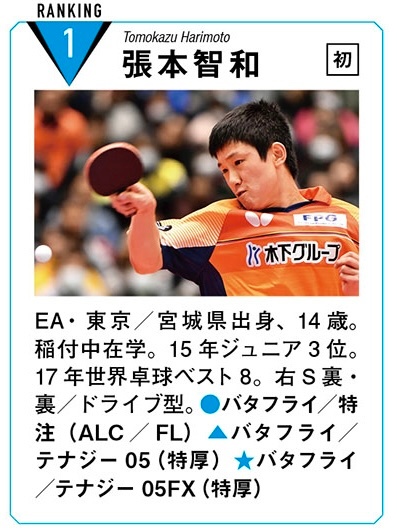 张本智和张本智和2026全日本乒乓球锦标赛 20260112【2018年全日本回顾】8年前的男子排名选手cr. 卓球王国PLUS《アーカイブ2018年4月号》全日本锦标赛特辑号・男子排名选手数据※器材为选手在全日本锦标赛中实际使用的配置。※未注明比赛名称的成绩,均指全日本锦标赛的成绩(年份按赛季年度记载)。● 球拍(握柄)▲ 正手(正胶)胶皮(厚度)★ 反手(反胶)胶皮(厚度)※姓名旁的带圈数字表示进入排名的累计次数。图一:14岁便达成史上最年轻冠军的张本智和图二:排名1Tomokazu Harimoto|张本智和(初次上榜)JOC精英学院・东京/宫城县出身,14岁。就读于稻付中学。2015年度全日青第3。2017年世乒赛八强。右手横拍,两面反胶。器材●球拍:Butterfly 特注(ALC/FL)▲正手:Butterfly Tenergy 05(特厚)★反手:Butterfly Tenergy 05FX(特厚)图三:2018年全日本锦标赛・男子排名选手(16人)数据