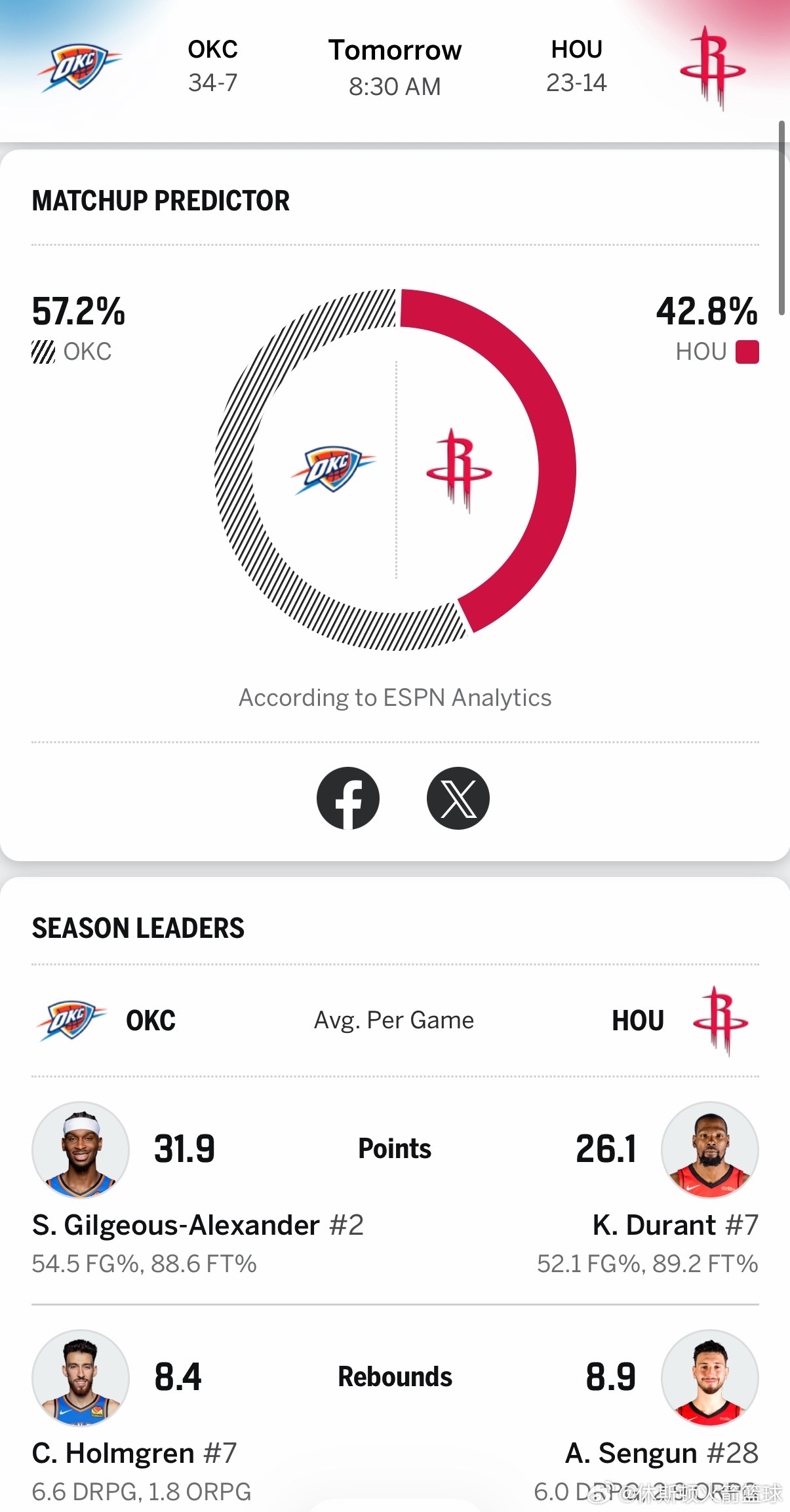 明天上午8点半,火箭主场对阵雷霆。ESPN预测火箭胜率42.8%这场比赛也是全美直播的比赛!!!!反正我火打谁都是五五开休斯顿火箭雷霆vs火箭休斯顿火箭