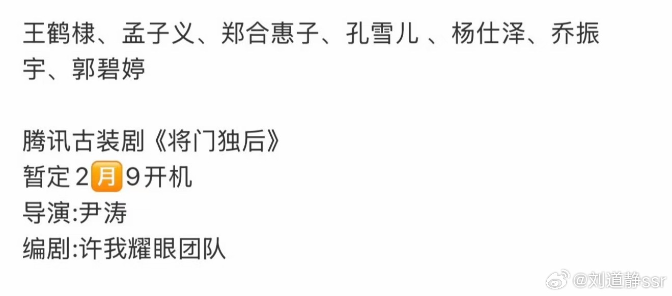将门毒后,2月份开机有点期待了,编剧是许我耀眼团队我觉得这部片子很有看点有点期待了,而且主角王鹤棣跟孟子义无变动将门毒后 北京