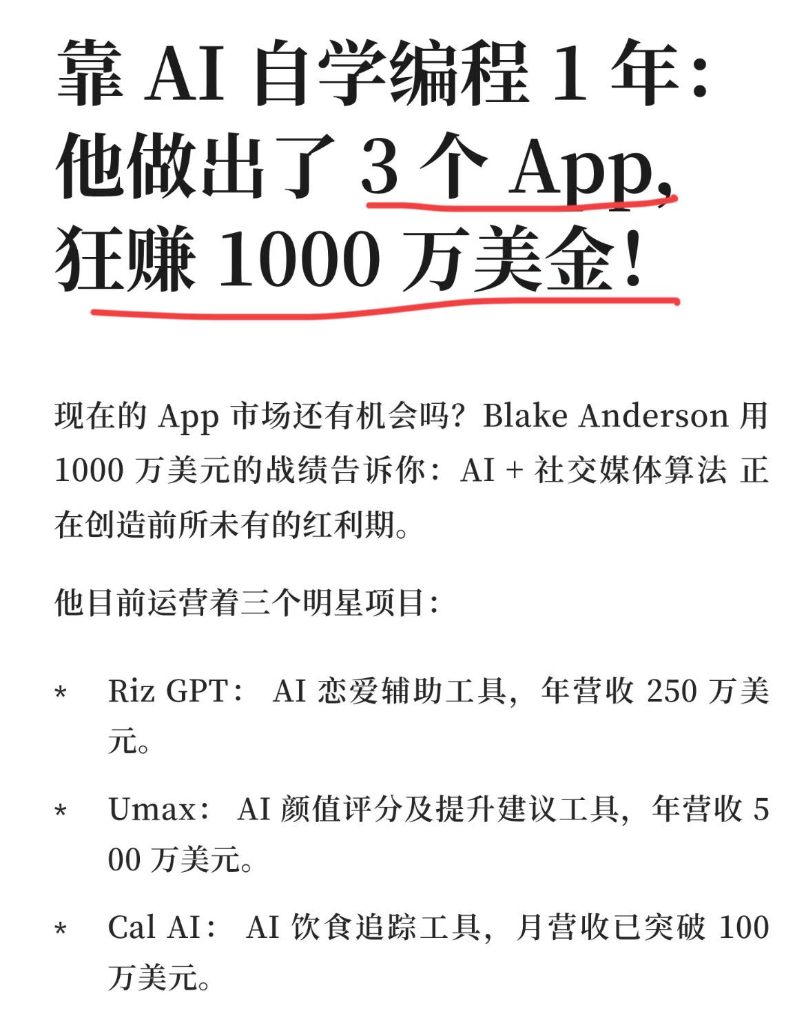 靠AI研发app,赚到巨额收益? 最近“死了么app”突然火爆,估值竟然高达1000万人民币, 给了很多app开发很大震撼。 国外也有类似的案例,比如这位老兄,利用AI自学和AI辅助编程,就做出三个爆款。 AI时代,技术好像更不值钱了, 以前想做app开发,好歹也得学OC、Swift、Java,而现在呢, 有了AI, 技术难度大大的降低了! 现在想出爆款,创意变得更重要了,甚至,起名字都比技术本身更重要了[笑哭] app ai ai开发工具 ai无代码开发 互联网 互联网大厂 编程 ai创意app