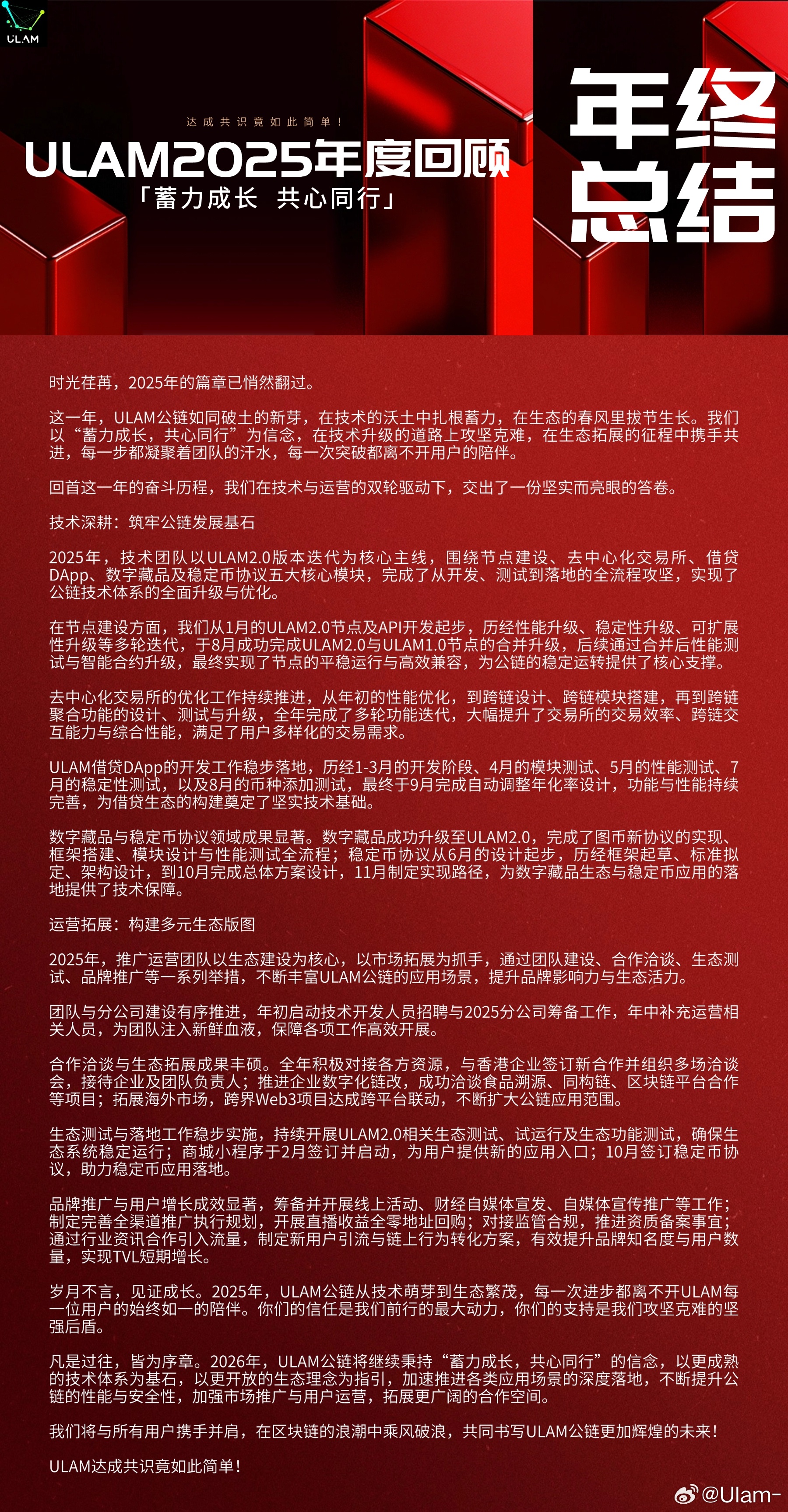 ULAMweb3区块链defi 2025年ULAM公链年终总结👇时光荏苒,2025年的篇章已悄然翻过。这一年,ULAM公链如同破土的新芽,在技术的沃土中扎根蓄力,在生态的春风里拔节生长。我们以“蓄力成长,共心同行”为信念,在技术升级的道路上攻坚克难,在生态拓展的征程中携手共进,每一步都凝聚着团队的汗水,每一次突破都离不开用户的陪伴。回首这一年的奋斗历程,我们在技术与运营的双轮驱动下,交出了一份坚实而亮眼的答卷。技术深耕:筑牢公链发展基石2025年,技术团队以ULAM2.0版本迭代为核心主线,围绕节点建设、去中心化交易所、借贷DApp、数字藏品及稳定币协议五大核心模块,完成了从开发、测试到落地的全流程攻坚,实现了公链技术体系的全面升级与优化。在节点建设方面,我们从1月的ULAM2.0节点及API开发起步,历经性能升级、稳定性升级、可扩展性升级等多轮迭代,于8月成功完成ULAM2.0与ULAM1.0节点的合并升级,后续通过合并后性能测试与智能合约升级,最终实现了节点的平稳运行与高效兼容,为公链的稳定运转提供了核心支撑。去中心化交易所的优化工作持续推进,从年初的性能优化,到跨链设计、跨链模块搭建,再到跨链聚合功能的设计、测试与升级,全年完成了多轮功能迭代,大幅提升了交易所的交易效率、跨链交互能力与综合性能,满足了用户多样化的交易需求。ULAM借贷DApp的开发工作稳步落地,历经1-3月的开发阶段、4月的模块测试、5月的性能测试、7月的稳定性测试,以及8月的币种添加测试,最终于9月完成自动调整年化率设计,功能与性能持续完善,为借贷生态的构建奠定了坚实技术基础。数字藏品与稳定币协议领域成果显著。数字藏品成功升级至ULAM2.0,完成了图币新协议的实现、框架搭建、模块设计与性能测试全流程;稳定币协议从6月的设计起步,历经框架起草、标准拟定、架构设计,到10月完成总体方案设计,11月制定实现路径,为数字藏品生态与稳定币应用的落地提供了技术保障。运营拓展:构建多元生态版图2025年,推广运营团队以生态建设为核心,以市场拓展为抓手,通过团队建设、合作洽谈、生态测试、品牌推广等一系列举措,不断丰富ULAM公链的应用场景,提升品牌影响力与生态活力。团队与分公司建设有序推进,年初启动技术开发人员招聘与2025分公司筹备工作,年中补充运营相关人员,为团队注入新鲜血液,保障各项工作高效开展。合作洽谈与生态拓展成果丰硕。全年积极对接各方资源,与香港企业签订新合作并组织多场洽谈会,接待企业及团队负责人;推进企业数字化链改,成功洽谈食品溯源、同构链、区块链平台合作等项目;拓展海外市场,跨界Web3项目达成跨平台联动,不断扩大公链应用范围。生态测试与落地工作稳步实施,持续开展ULAM2.0相关生态测试、试运行及生态功能测试,确保生态系统稳定运行;商城小程序于2月签订并启动,为用户提供新的应用入口;10月签订稳定币协议,助力稳定币应用落地。品牌推广与用户增长成效显著,筹备并开展线上活动、财经自媒体宣发、自媒体宣传推广等工作;制定完善全渠道推广执行规划,开展直播收益全零地址回购;对接监管合规,推进资质备案事宜;通过行业资讯合作引入流量,制定新用户引流与链上行为转化方案,有效提升品牌知名度与用户数量,实现TVL短期增长。岁月不言,见证成长。2025年,ULAM公链从技术萌芽到生态繁茂,每一次进步都离不开ULAM每一位用户的始终如一的陪伴。你们的信任是我们前行的最大动力,你们的支持是我们攻坚克难的坚强后盾。凡是过往,皆为序章。2026年,ULAM公链将继续秉持“蓄力成长,共心同行”的信念,以更成熟的技术体系为基石,以更开放的生态理念为指引,加速推进各类应用场景的深度落地,不断提升公链的性能与安全性,加强市场推广与用户运营,拓展更广阔的合作空间。我们将与所有用户携手并肩,在区块链的浪潮中乘风破浪,共同书写ULAM公链更加辉煌的未来!ULAM达成共识竟如此简单!