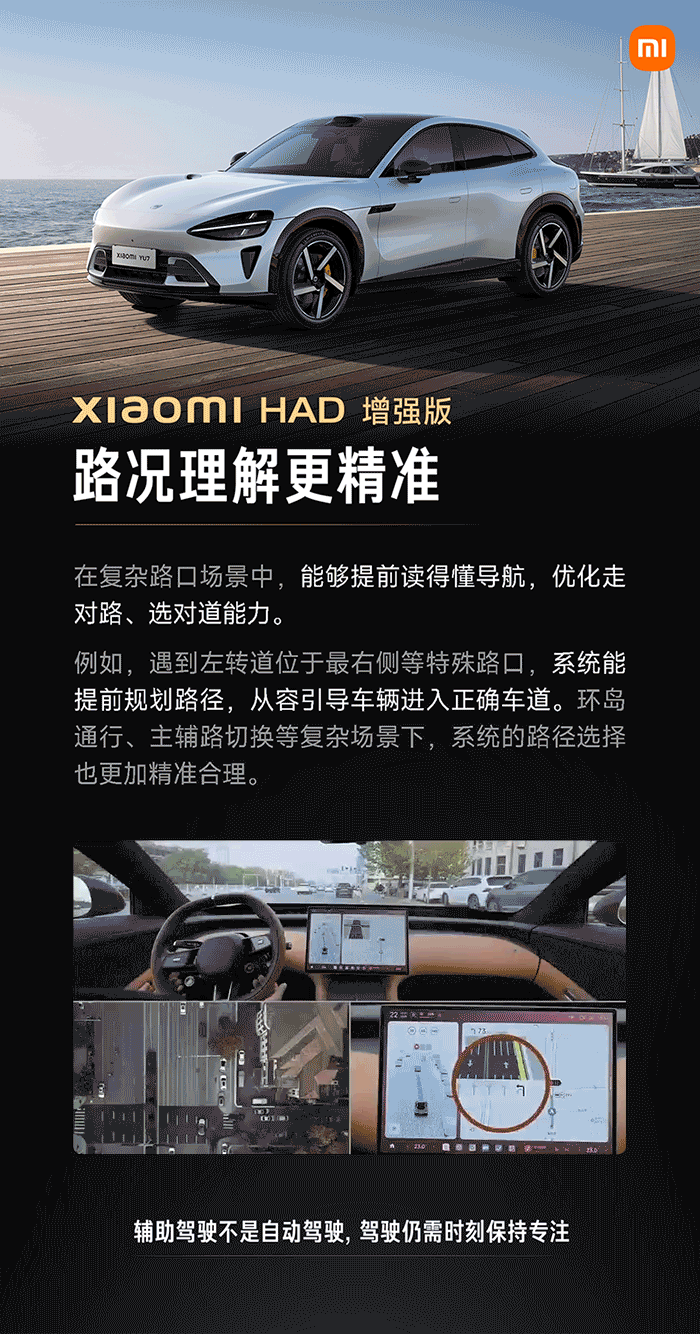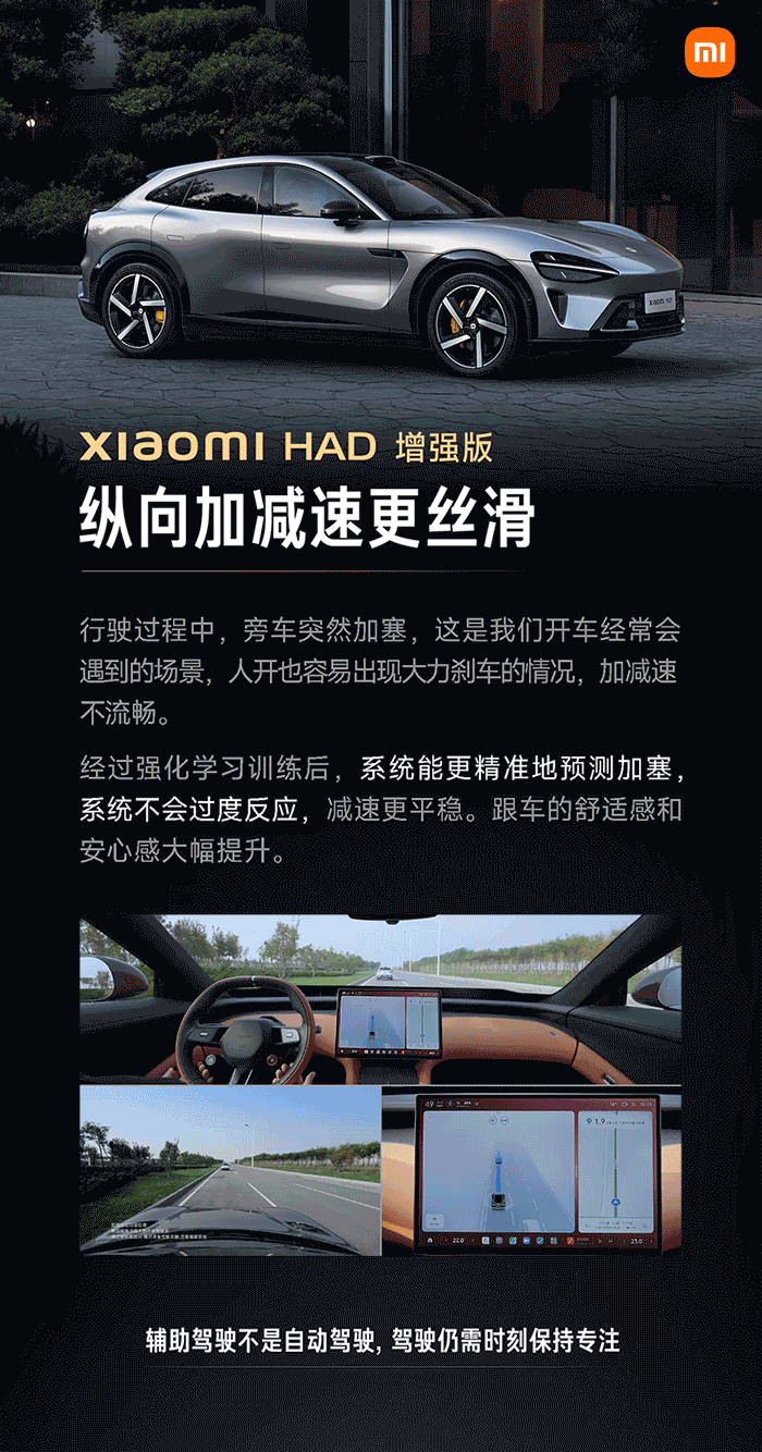 【雷军回应网友对小米 HAD 辅助驾驶 1000 公里门槛降低呼吁,称下次 OTA 调整】小米雷军回应了网友对小米 HAD 辅助驾驶 1000 公里数降低的呼吁,他表示,团队已经注意到了,经过评估,在下一次 OTA 会降低门槛。小米 HAD 辅助驾驶 1000 公里的使用门槛指新手要开 1000km 以后才能使用辅助驾驶。目前,小米 HAD 增强版已经开始陆续推送,主要升级体验点包括:纵向加减速更丝滑,横向变道更果断,路况理解更精准。在旁车加塞、超车并线、灵活绕行、复杂路口通行等场景表现优秀。雷军直播新一代su7
