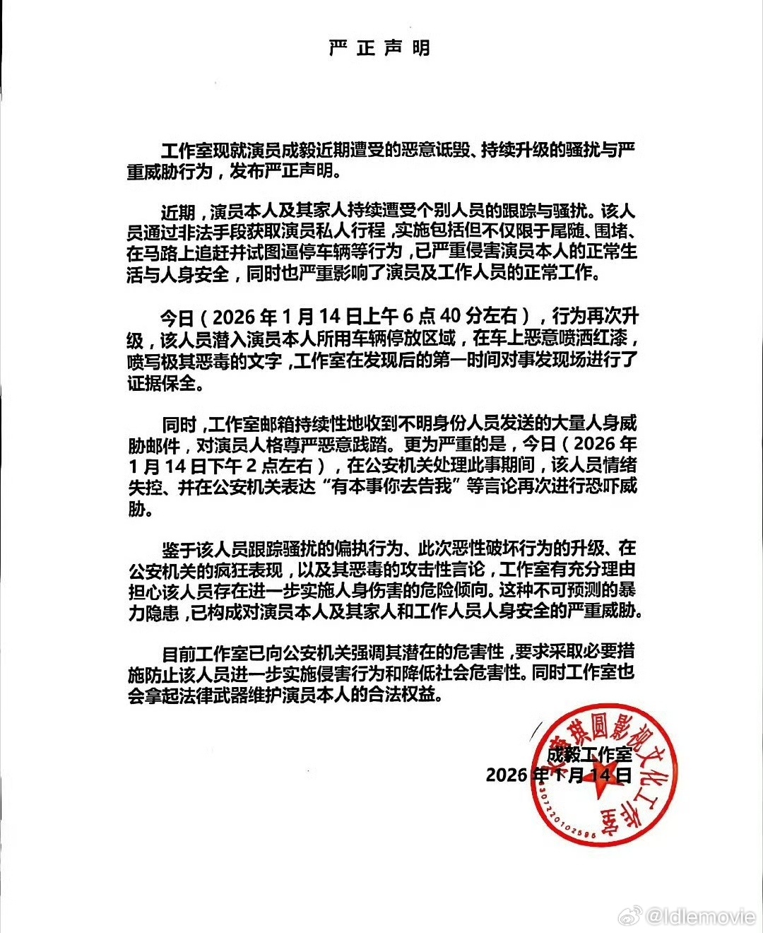 为成毅跑一百步,对此等黑恶行为必须严惩不贷。今日我若冷眼旁观,他日祸临己身,将无人为我摇旗呐喊,中国是法制社会,成毅是优秀演员,保护其人身安全刻不容缓。别再压热搜,让犯罪分子无处遁形,让遵纪守法的公民安心工作生活。成毅工作室声明年度角色前四成毅占三跨年电影愿