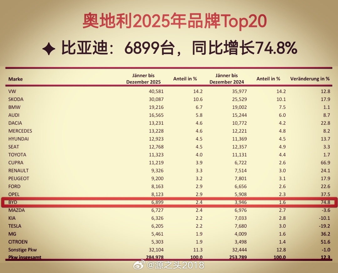 2026年预期销量超10000台,并部署超100座兆瓦闪充站!比亚迪奥地利总经理Danijel Dzihic近日表示。2025年,比亚迪在奥地利累销6899台,同比增长74.8%。