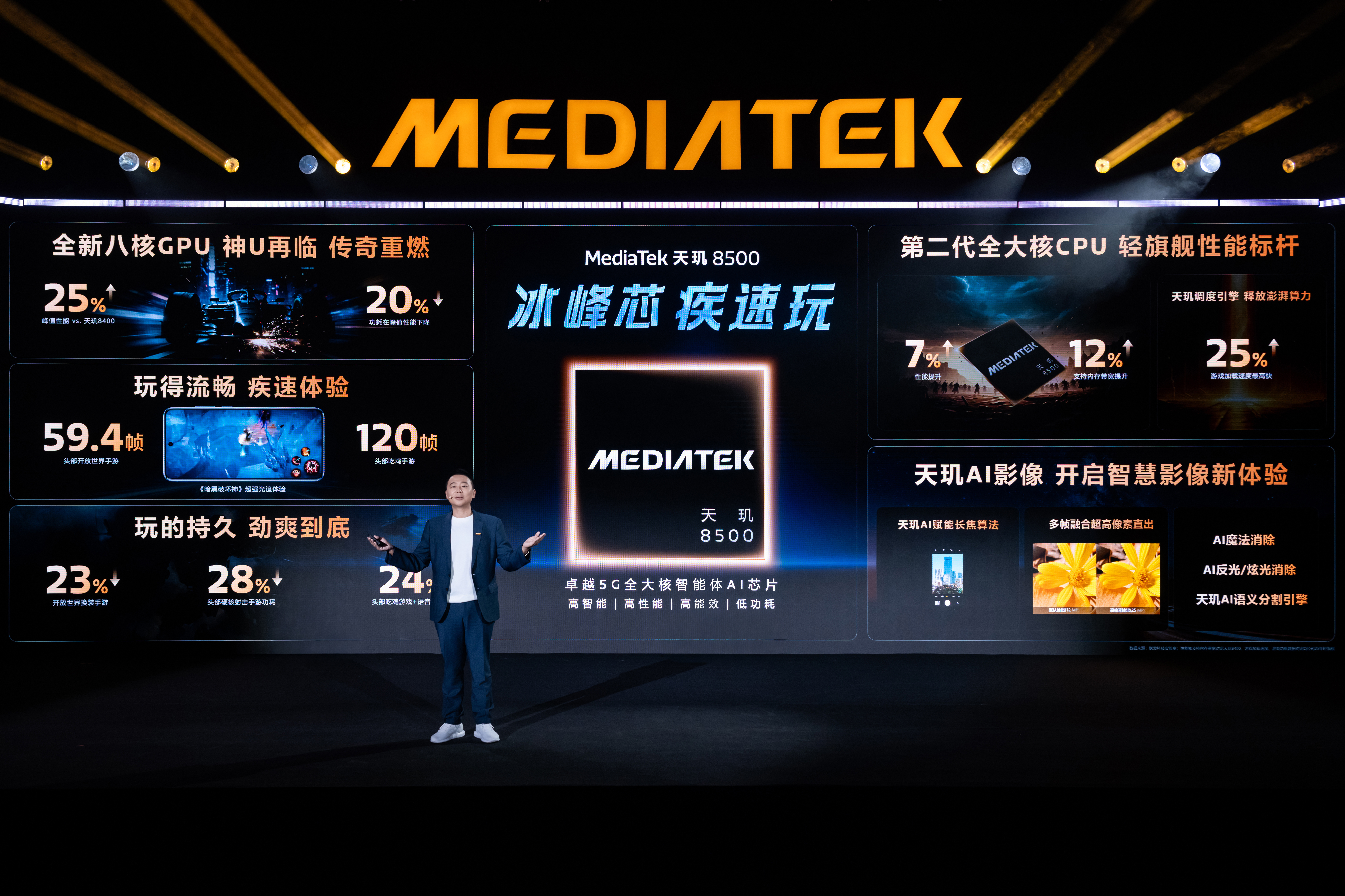 旗舰细分市场再添猛将!MediaTek 全新推出天玑9500s与天玑8500移动芯片,以全大核架构、前沿技术重塑体验边界。天玑9500s 搭载3nm制程,Cortex-X925超大核主频3.73GHz,Immortalis-G925 GPU加持光追与165超高帧游戏,配合旗舰NPU与Imagiq影像,实现AI创作、8K视频录制全场景高能。天玑8500采用4nm制程,8颗A725大核+性能提升25%的GPU,延续 “神 U” 基因,光追落地主流手游,AI反光消除等功能让影像更出众。两款芯片在5G、Wi-Fi连接上全面升级,践行 “科技新生活人人可享” 的使命,你期待哪款机型首发?