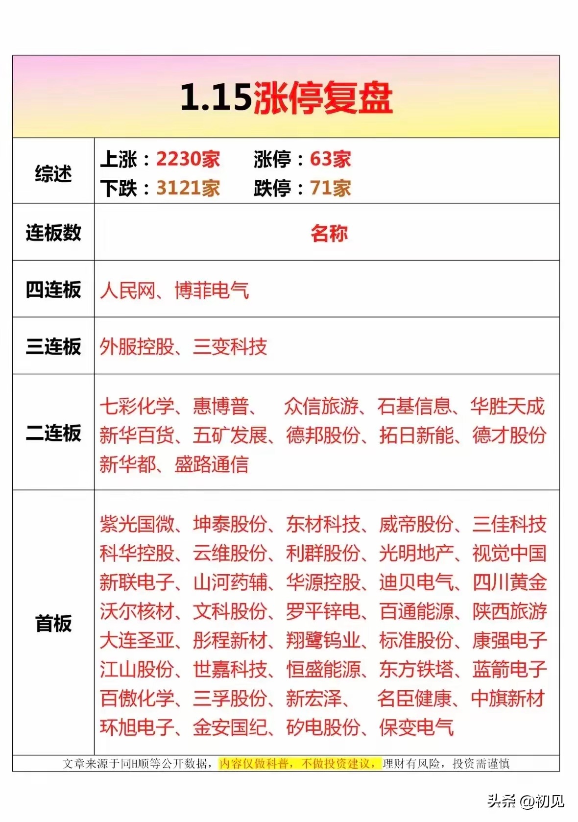 1.15涨停梯队梳理分析!今日A股市场呈现涨少跌多格局,上涨2230家、下跌3121家,涨停63家、跌停71家,市场情绪分化显著。涨停梯队结构清晰,最高高度为四连板(2只),其次是三连板(2只)、二连板(12只),首板以47只占据涨停绝对主力,体现短线资金更偏好首板低风险博弈,连板接力情绪偏弱。个股梳理分析1. 人民网:四连板标的之一,是涨停梯队最高高度股,市场跌多涨少背景下走出四连板,凸显资金对其题材的认可,成为短线辨识度极高的标的。2. 博菲电气:与人民网共同构成四连板梯队,分化行情中实现四连板,资金接力意愿较强,是短线连板方向的核心标的,撑起梯队最高高度。3. 外服控股:三连板标的,承接四连板的高度,处于连板梯队中间层级,短线资金对其题材持续性有预期,是连板接力的重要标的。4. 三变科技:同为三连板标的,是连板梯队的关键组成,在四连板之下形成资金接力,体现板块内题材的传导效应与资金的博弈思路。5. 七彩化学:二连板标的之一,属于连板梯队中间力量,分化环境中实现二连板,资金对其短线走势做多意愿强烈,题材关注度较高。6. 惠博普:二连板梯队成员,在三连板之下形成接力,短线资金围绕其题材展开博弈,成为二连板中活跃度较高的标的之一。7. 众信旅游:二连板标的,跌多涨少的市场中走出连板,体现资金对旅游题材的短期关注,是二连板梯队里的重要成员。8. 石基信息:二连板标的,分化行情中实现连板,资金看好其所属赛道的短期机会,成为二连板中具备代表性的核心标的。9. 华胜天成:二连板梯队成员,市场情绪偏弱时走出连板,短线资金博弈意愿较强,是二连板中资金关注度较高的个股。10. 新华百货:二连板标的之一,处于连板梯队中间层级,资金对其消费类题材有短期布局意愿,推动其成功实现二连板。11. 五矿发展:二连板梯队成员,依托矿产相关题材实现连板,分化行情中体现出题材的阶段性热度,是二连板的重要标的。12. 德邦股份:二连板标的,物流题材下的短线连板股,跌多涨少的环境中获资金青睐,成为二连板梯队的组成部分。13. 拓日新能:二连板梯队成员,新能源题材下的连板标的,资金对新能源赛道短期机会有所布局,助力其实现二连板。14. 德才股份:二连板标的之一,建筑装饰题材下的短线连板股,分化行情中获得资金接力,是二连板梯队的一员。15. 新华都:二连板梯队成员,消费零售题材下的连板标的,市场分化时走出连板,体现资金对消费题材的短期挖掘。16. 盛路通信:最后一只二连板标的,通信题材下的短线连板股,在二连板层级中收尾,资金博弈力度相对温和,题材热度一般。17. 紫光国微:首板核心标的之一,半导体题材下的涨停股,首板数量占优的背景下,凭借题材关注度成为首板中的热门标的。18. 坤泰股份:首板标的,汽车零部件题材下的涨停股,在首板大军中依托细分题材获资金青睐,短线做多动能快速释放。19. 东材科技:首板梯队成员,新材料题材下的涨停股,市场分化时资金布局首板,其所属题材的短期机会被资金捕捉。20. 威帝股份:首板标的,汽车电子题材下的涨停股,首板数量居多的行情中,凭借题材属性获得资金的短期关注与布局。21. 三佳科技:首板梯队成员,电子元件题材下的涨停股,跌多涨少的市场中,资金通过首板布局细分赛道的阶段性机会。22. 科华控股:首板标的,汽车零部件题材下的涨停股,首板大军中依托汽车产业链题材,获资金进行短线做多布局。23. 云维股份:首板梯队成员,煤化工题材下的涨停股,分化行情中,资金选择首板布局传统化工赛道的短期机会。24. 利群股份:首板标的,商业零售题材下的涨停股,消费题材在首板中有所体现,资金对消费赛道短期机会进行挖掘。25. 光明地产:首板梯队成员,房地产题材下的涨停股,首板数量占优的行情中,地产题材的短期机会被资金捕捉并推动涨停。总结今日涨停市场呈现高连板数量少、首板占绝对主力的特征,四连板撑起梯队高度框架,二连板形成中间接力层,首板是资金博弈主要阵地。市场跌多涨少的背景下,短线资金更倾向首板低风险博弈,连板接力情绪偏弱,后续需关注高连板标的的持续性及首板中强势题材的发酵情况。本文涉及资讯、数据等内容来自网络公共信息,仅供参考,不构成投资建议!