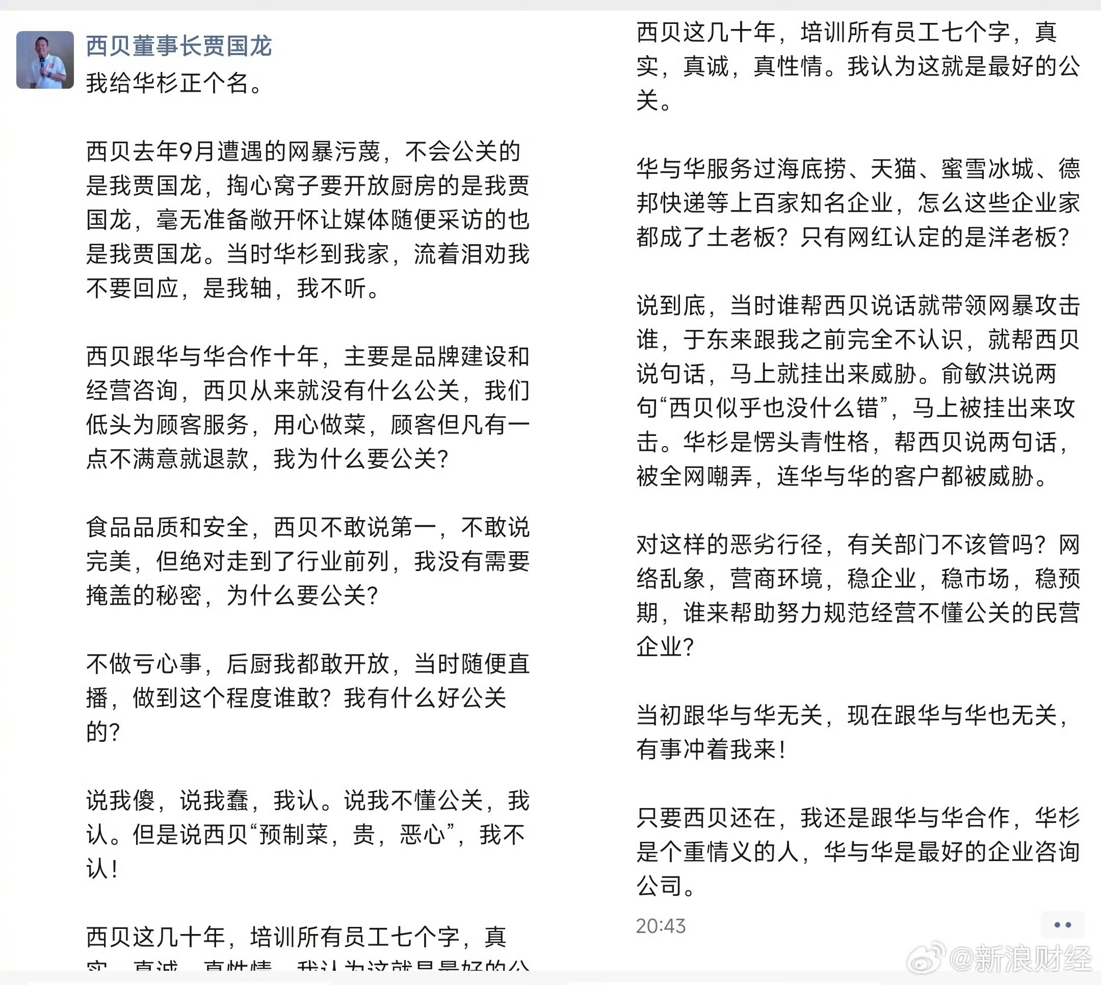 求求了,别在出来说话了,干嘛总要掉进这种「自证」的局面啊?完全没有必要…西贝的服务确实好,体验各方面真的不错,但是东西确实味道没有进步,价格如今看也不是便宜的。打铁还看自身硬,重点完全错了贾国龙为华与华正名
