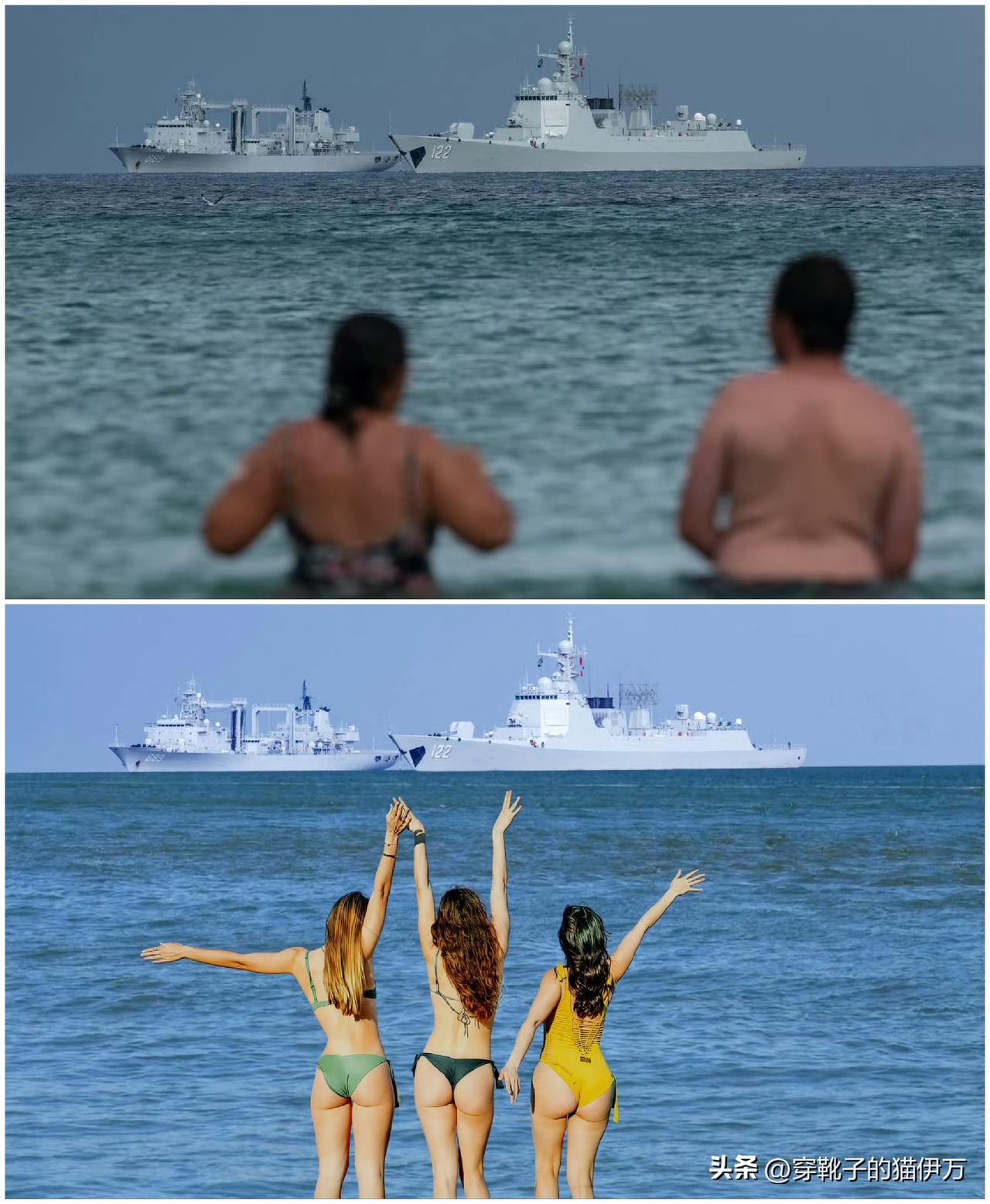 [捂脸] 同样都是052D,就看你怎么拍了——其中一幅照片色泽灰暗,晦涩压抑,背景人体臃肿肥胖,颇有一点西方通讯社那种调调。而另一张照片则是阳光明媚,水天分明,人体青春健美……摄影真的是门艺术,宣传工作真的是博大精深啊。