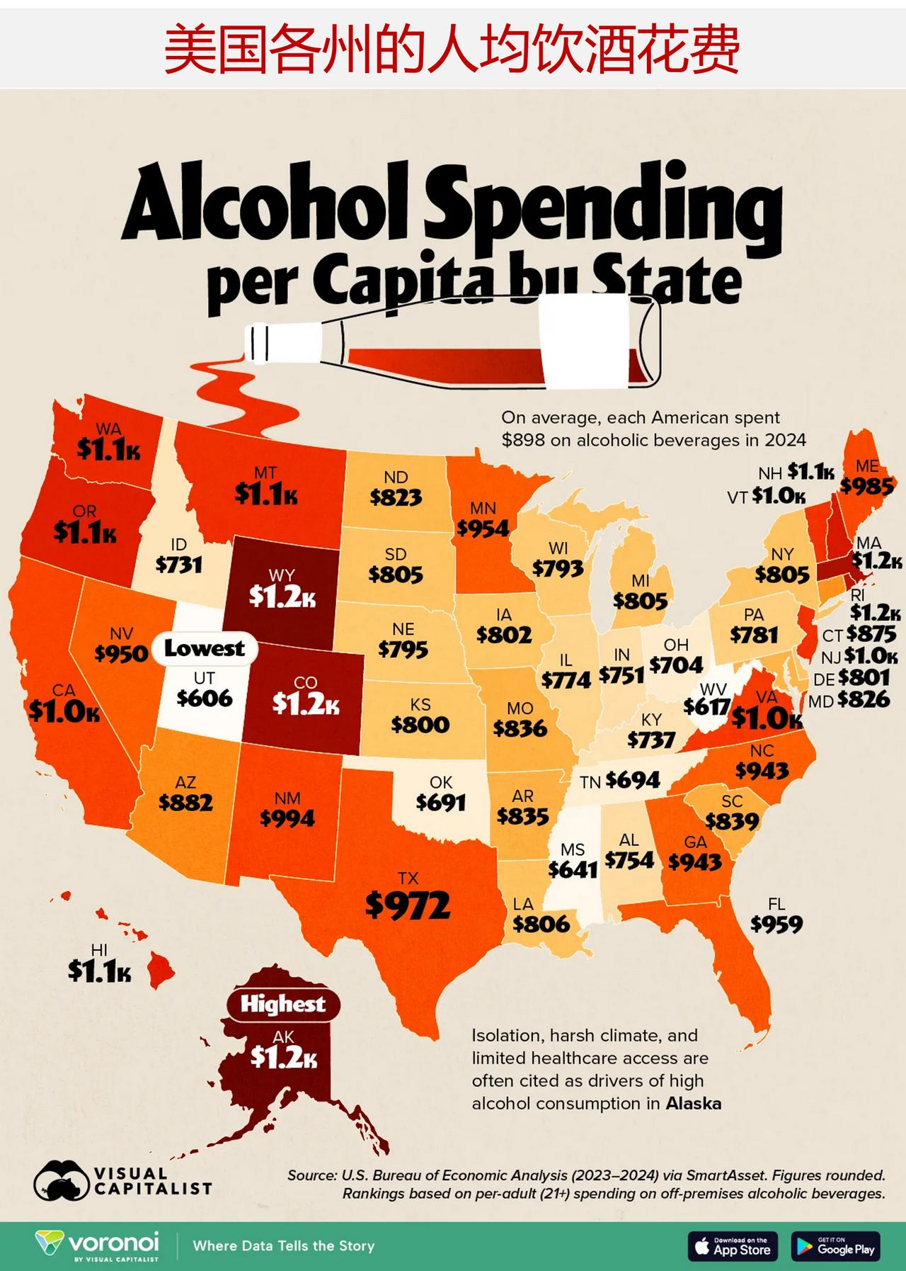 美国哪里人均饮酒支出最高?来看各州的饮酒花费情况 美国的饮酒习惯因居住地的不同而有很大差异。 文化规范、气候条件、收入水平以及获得服务的便利程度都会影响居民在酒精饮料上的消费金额。此图表展示了全美 50 个州每位成年人在酒精饮料上的消费情况。 该数据来自 SmartAsset 。 ——阿拉斯加处于领先位置 阿拉斯加位居榜首,2024 年该州成年人人均饮酒花费将近 1250 美元。 该州的领先地位往往与孤立状况、恶劣的气候条件以及难以获得医疗保健和戒毒服务等因素有关。由于运输成本的增加,物价也随之上涨,从而导致总支出增加。 怀俄明州和科罗拉多州的这一数字紧随阿拉斯加之后,每名成年人饮酒花费均超过了 1200 美元。 ——地区性酒精消费趋势 许多饮酒花费最高的州都集中在西部和东北部地区。马萨诸塞州、罗得岛州和新罕布什尔州位列前十,与俄勒冈州和华盛顿州并列。 在另一端,犹他州成年人的饮酒花费最低,约人均为 600 美元。该州拥有庞大的宗教群体,并且有着更为严格的酒精管理规定,这使得其酒精消费和支出远低于全美平均水平。 包括西弗吉尼亚州、密西西比州、田纳西州和俄克拉荷马州在内的几个南部和中西部州也处于排名的末尾位置。这些州的文化观念、更为严格的酒类管理规定以及较低的平均收入水平,都有助于解释这种现象。