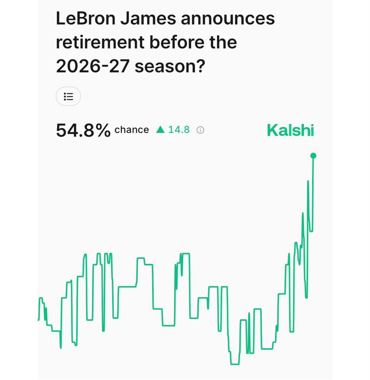 相关网站预测詹姆斯下赛季开始前退役的可能性已经来到了54.8%! 那么,詹姆斯退役了,你还看NBA吗? 詹姆斯本赛季场均25.2分、5.7篮板、6.1助攻,投篮命中率55.0%,三分命中率约30.6%。 詹姆斯