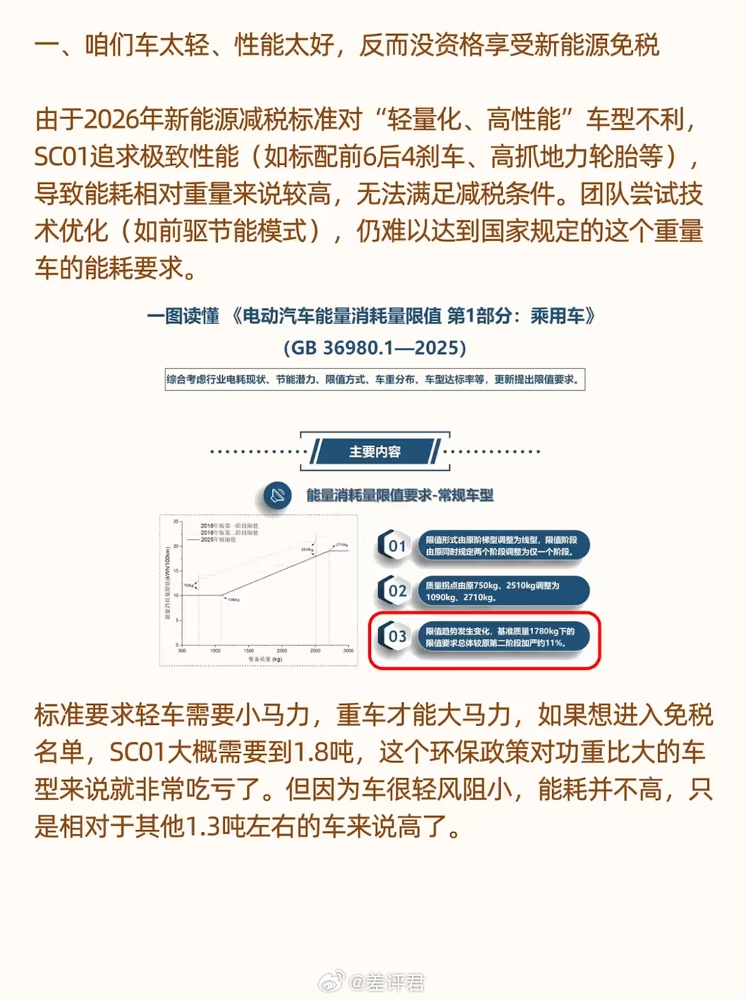 #差评说车# 小跑车太惨了,被新国标误伤了。大致意思就是因为车太轻、马力又大,导致能耗偏高,符合不了新国标鼓励新能源车降低能耗的免税条件。之前设定好的车重是1.3吨多,动力不降的话,想减免得把车重加到1.8吨多 。说实话,这波小跑车是真挺冤的,但没办法谁让它是台玩乐车呢。