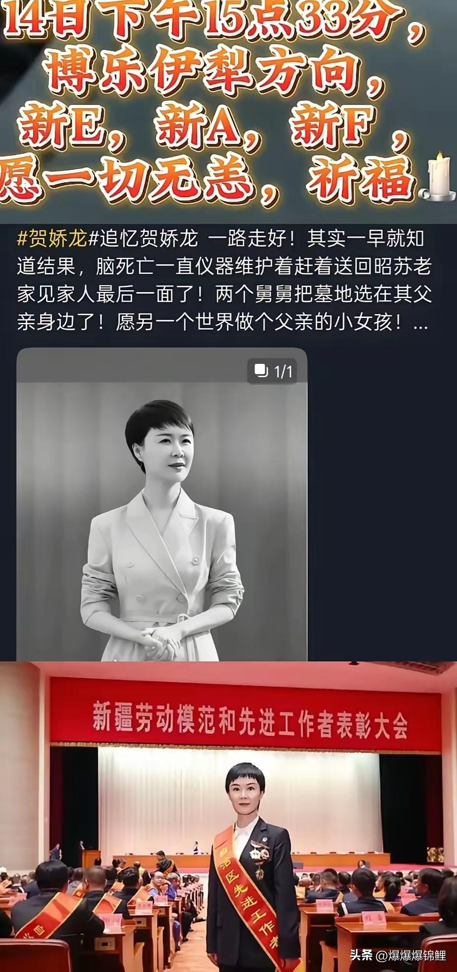 昨儿下午3点多,有人在路边拍到了那个特殊车队,第一眼看以为是啥大领导视察,仔细一看才懂是送贺娇龙主任回昭苏老家。 警车在前头疯狂开道,紧咬着的是救护车,后面跟着奥迪和皮卡。 这几辆车挂着新A、新E、新F的牌子,那是乌鲁木齐、博州和伊犁三地在接力护送啊。 靠机器硬撑着一点心跳,就是为了跟阎王爷抢时间,让她活着回到那片魂牵梦萦的土地。 当晚家人见了一面,人就走了,永远留在了昭苏。 这5年她像个陀螺转了500场助农直播,带货283亿,全是给老百姓挣的,自己一分佣金没拿。 现在埋在老父亲边上,这个“大忙人”总算能睡个整觉了。