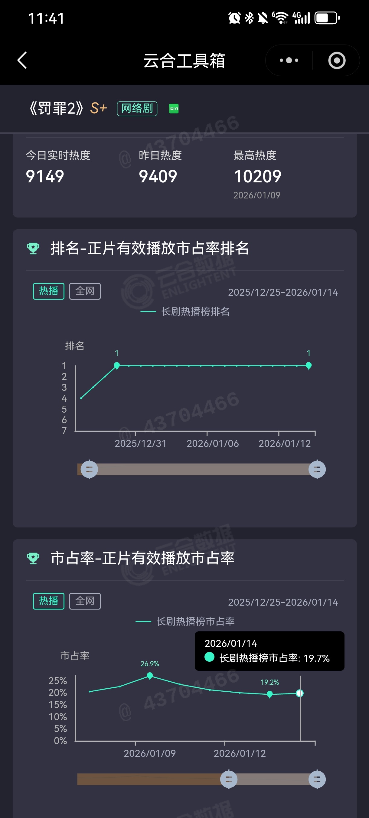有人在意的角落里,《罚罪2》9号超点达到市占率最高值,后续会员(没买超点)断更,市占率一路缓慢下行,14号会员复更,市占率又回升了!在此期间热度一直稳定在9300以上,云合和酷云点播市占率一直维持全网第一!养肥了,养肥了!还没看的这会儿可以进场了!黄景瑜罚罪2
