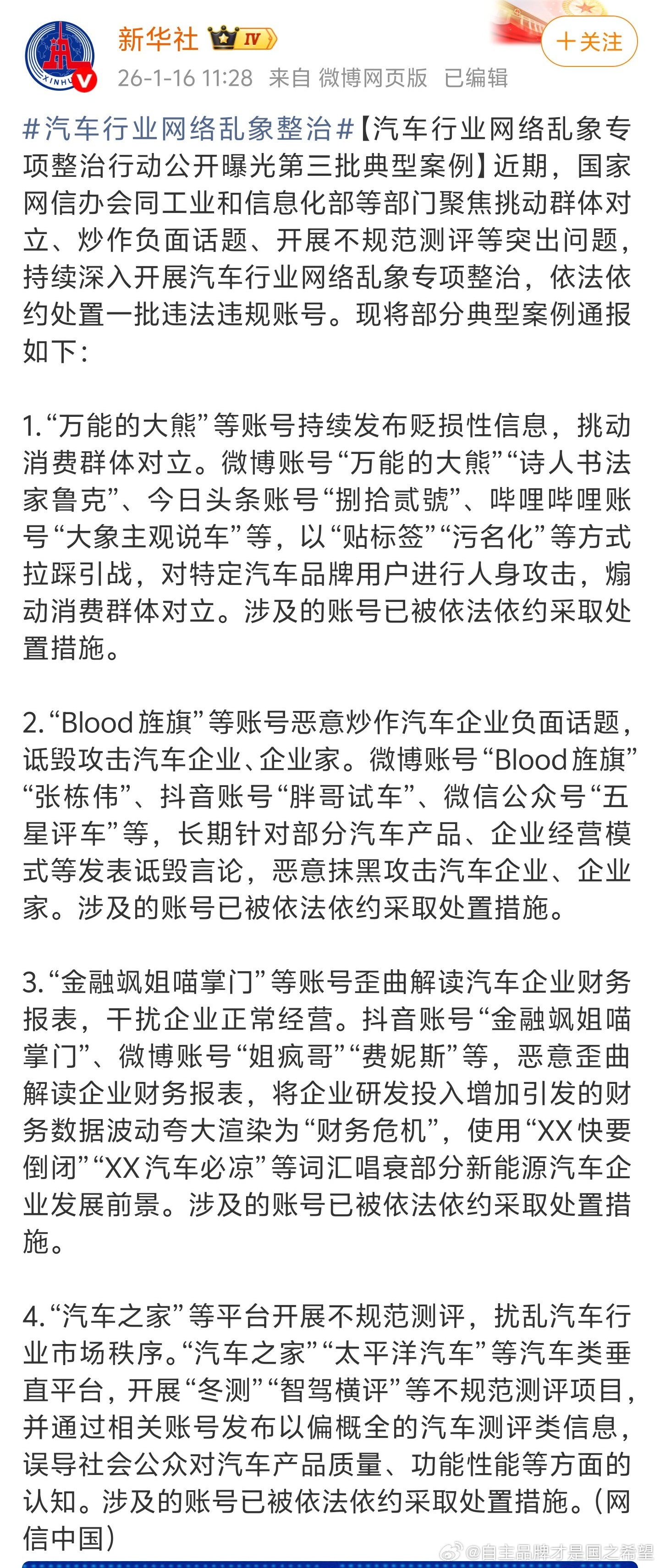 新华社汽车行业网络乱象整治点名万能大熊大象主观说车blood旌旗汽车之
