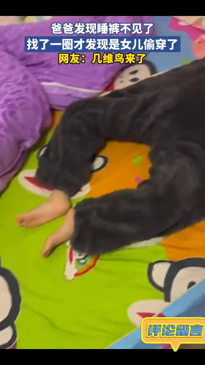 爸爸发现睡裤不见了,找了一圈才发现是女儿偷穿了。网友:几维鸟来了。 1月14日广西。评论留言。