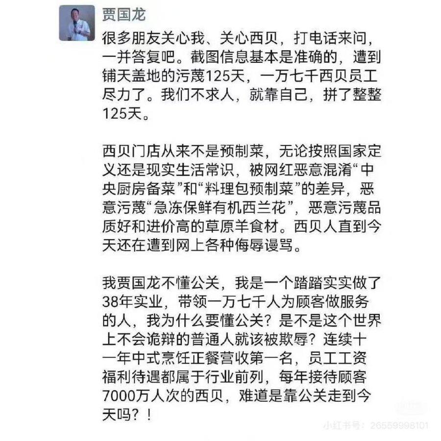 这么多年来,中国市场上倒下的企业如过江之鲫,其中不乏规模庞大的工厂和公司。凭什么别的企业在市场浪潮中被淘汰就是正常的优胜劣汰,到了你西贝这里,就成了不可触碰的悲剧?难道就因为你西贝名气大,就该享有某种特权吗。这显然是不公平的。 一个真正好的企业,不会因为创始人的一次两次言行就倒下。这也不是罗永浩或者互联网太狠毒,从来都是市场的反馈,消费者用脚投票的结果。