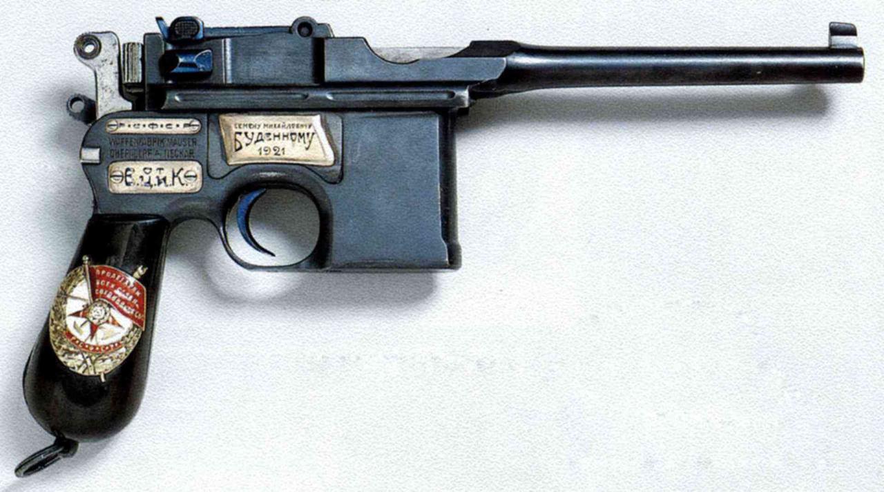 [呲牙] 毛子的盒子炮——1945 年 5 月初,苏联近卫第 3 骑兵军与美军部队在雷根斯堡会师。大家注意:苏军军官佩戴了毛瑟 C96 手枪,其硕大的枪套上还有复杂的镶嵌花纹。这很有可能是内战时期的荣誉武器,一般来说在枪身上还会镌刻镶嵌各种图案或花纹(参见图3~4)。 1945 年 5 月的德国已陷入全面崩溃:东线,苏军突破奥德河 — 尼斯河防线,兵临柏林城下;西线,美军、英军突破齐格菲防线,深入德国南部巴伐利亚州腹地。雷根斯堡(Регенсбург)位于多瑙河上游,是巴伐利亚州的交通枢纽,控制着德国南部通往奥地利的铁路干线,战略位置关键。1945 年5 月 2 日,美军第 3 集团军的先头部队率先攻占雷根斯堡,肃清当地德军残余;5 月中旬,苏联近卫第 3 骑兵军随乌克兰第 1 方面军右翼部队推进至此,与美军实现正式会师。此时距离纳粹德国无条件投降(5 月 8 日)仅剩数日,这场会师成为欧洲战场反法西斯同盟协同作战的标志性事件之一。
