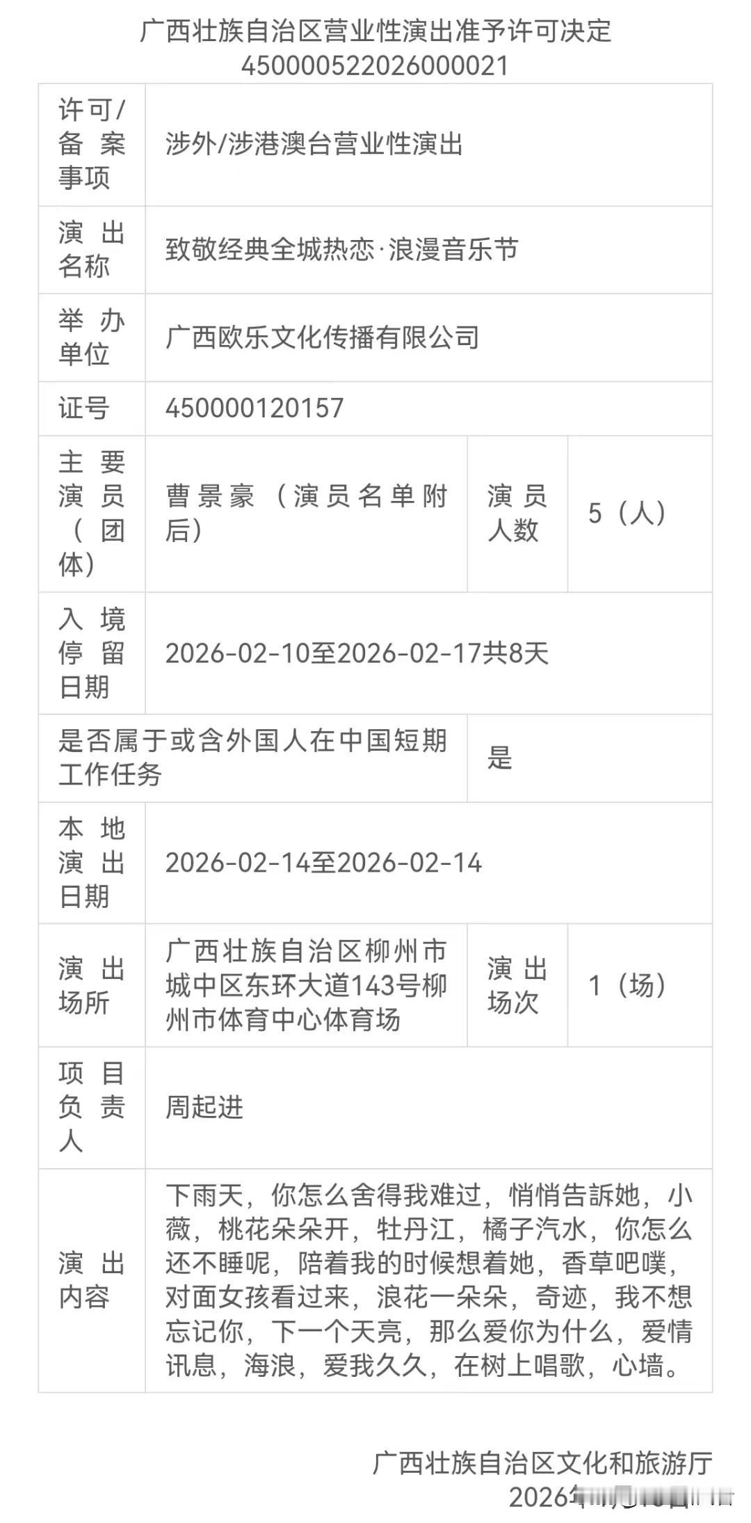 小微,我爱你😘 品源兄要来柳州咯!是品源,不是品冠[呲牙] 就在刚刚,1月16日广西壮族自治区文化和旅游厅发布涉外/涉港澳台营业性演出审批结果 其中显示2月14日(情人节)将在柳州市体育中心主体育场举办致敬经典全城热恋·浪漫音乐节歌手黄品源、阿牛郭静、南拳妈妈都要来!一波回忆杀来了[呲牙]