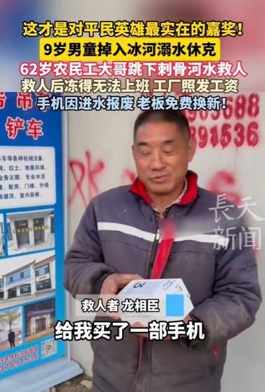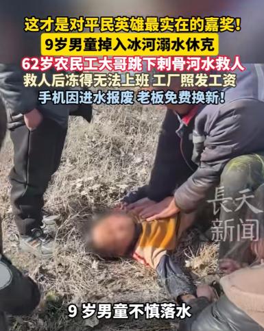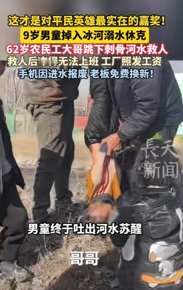 1月11日,河南兰考县,一名9岁男孩溺水沉入水底,岸上的妹妹哭喊着求救,危急时刻,两名农民工大哥冒着严寒,跳入冰冷的水里将男孩捞了上来,男孩陷入昏迷,失去了呼吸,大家都以为男孩没了,但农民工大哥没有放弃,终于,经过10分钟的心肺复苏,男孩成功被救活了过来! 1月11日的河南兰考,9岁的小浩和妹妹趁着爷爷奶奶不注意,偷偷跑到河边玩耍,兄妹俩追着跑着,小浩脚下一滑,整个人瞬间坠入冰冷的河水中,只来得及喊出半声 “妹妹”,就被浑浊的河水吞没。 “救命啊!哥哥掉河里了!” 妹妹吓得魂飞魄散,一边往附近的水泥厂方向跑,一边撕心裂肺地哭喊。 这时候,离河边不远的水泥厂车间里,62岁的龙相臣正和45岁的工友代艳合吭哧吭哧搬水泥袋子。 突然就听见外头传来撕心裂肺的呼救声。龙相臣手一抖,扛在肩上的水泥袋 “哐当” 一声砸在地上,“坏了!肯定出事了!” 他喊了一嗓子,撒腿就往河边冲,代艳合也二话不说,扔下手里的活计跟在后面狂奔,俩人连沾着水泥灰的手套都没顾上摘。 跑到河边一看,发现河面上就剩个冒着寒气的冰窟窿,小浩的影子都瞅不见,只有那个小姑娘瘫在地上,哭得直抽抽。 龙相臣心里咯噔一下,“孩子指定沉底了,赶紧救!” 他啥也没寻思,棉袄拉链都没拉,兜里那部用了好几年的老年机还在 “嗡嗡” 震,他就 “扑通” 一声跳进了河里。 河水刚没过小腿,那股子寒气就跟无数根小针扎似的,顺着毛孔往骨头缝里钻。 龙相臣今年都62了,平时在工地上搬砖扛水泥,身子骨看着硬朗,可哪架得住这冰碴子水的折腾,刚走两步,腿肚子就开始打哆嗦。 代艳合也没含糊,紧跟着跳了下去,冰冷的河水瞬间浸透了他的工装裤,可他愣是咬着牙,跟龙相臣并排往河中间摸。 浑浊的河水压根看不清底下的情况,两人只能弯着腰,用手在水里一寸一寸地摸索。 好几次摸到水草和石头。时间一分一秒地过去,龙相臣的手冻得发紫发麻,几乎都快没知觉了,可他心里只有一个念头:“必须找到孩子,晚一步就没命了!” 就这样在冰河里足足摸了五分钟,就在两人快要撑不住的时候,龙相臣的手突然碰到了一块软乎乎的布料。 他心里一喜,赶紧使劲抓住,果然摸到了一只冰凉的小手。“找到了!在这儿呢!” 代艳合赶紧凑过来,两人一人拽着小浩的胳膊,一人托着他的后背,拼尽全身力气往岸边拖。 等把小浩拖上岸时,两人的嘴唇都冻成了青紫色,站在原地直打晃。 小浩软趴趴地躺在地上,脸色青紫,嘴唇毫无血色,浑身冰凉得像块冰疙瘩,代艳合赶紧掏出手机打 120,手指冻得僵硬,按了好几次才拨通号码。 龙相臣只学过一点心肺复苏的皮毛,平时根本没实际操作过,但此刻他只能硬着头皮上,双手交叉按在小浩的胸口,开始有节奏地按压。 按压了没几分钟,他的胳膊就酸得抬不起来,呼吸也变得粗重。代艳合打完电话,立刻接替他继续按压,两人就这么轮流上阵,谁也不敢停歇。 就在按压到第十分钟的时候,小浩的身子猛地一挺,吐出了好几口浑水,紧接着微弱的哭声传了出来。“活了!孩子活了!” 代艳合激动地大喊,围观的人群里瞬间爆发出欢呼声。 没过多久,救护车的鸣笛声从远处传来,医护人员赶到后,立刻对小浩进行了紧急处理,然后小心翼翼地把他抬上救护车送往医院。 龙相臣想掏出手机给家里报个平安,一摸兜才发现,手机早就被河水泡得开不了机,屏幕黑沉沉的,怎么按都没反应。 两人互相搀扶着回到工厂,浑身湿透的样子让老板和工友们都吃了一惊。 听两人说完救人的经过,老板当即拍板:“你们俩立了大功!接下来好好在家养身体,这几天不用来上班,工资照发,一分都不会少!” 看到龙相臣手里泡坏的手机,老板又补充道:“手机我给你换新的,也算我一点心意,你们的见义勇为,值得所有人尊敬。” 接下来的几天,龙相臣和代艳合因为受凉,都有些感冒发烧,在家休息了好几天才缓过来,工厂老板兑现了承诺,不仅给两人照发了工资,还真的给龙相臣送来了一部新手机。 他们没有什么惊天动地的豪言壮语,也没有光鲜亮丽的身份背景,可就是这两个普普通通的汉子,在危急关头挺身而出,用自己的勇气和坚持,从死神手里硬生生抢回了一条鲜活的生命。 对于这件事,您有什么想说的吗?欢迎评论区留言讨论。 信源:今视频长天新闻2026-01-15——《这才是对平民英雄最实在的嘉奖!9岁男童掉入冰河溺水休克,62岁农民工大哥跳下刺骨河水救人…》