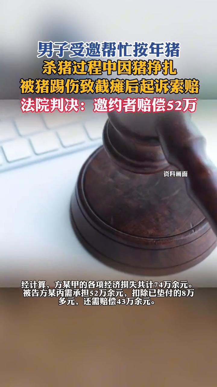 男子受邀帮忙按年猪,杀猪过程中因猪挣扎被猪踢伤致截瘫后起诉索赔。法院判决:邀约者赔偿52万。 1月14日,据中国裁判文书网,四川省合江县方某丙杀年猪、邀请同村方某甲帮忙按猪在杀猪过程中因猪挣扎踢倒方某甲导致方某甲截瘫。事后,双方协商赔偿未果,方某甲将方某丙诉至法院。 法院依据关于无偿帮工的法律规定进行审理,指出被帮工人有责任为帮工人提供安全的帮工环境和保护措施。法院认定双方均存在过错。被告方某丙未提供足够的安全防护,存在过错。原告方某甲作为有经验的成年人,自身也未尽到审慎注意义务。法院据此酌情判决被告承担70%的责任,原告自担30%的责任。 经计算,方某甲的各项经济损失共计74万余元。被告方某丙需承担52万余元,扣除已垫付的8万多元,还需赔偿43万余元。