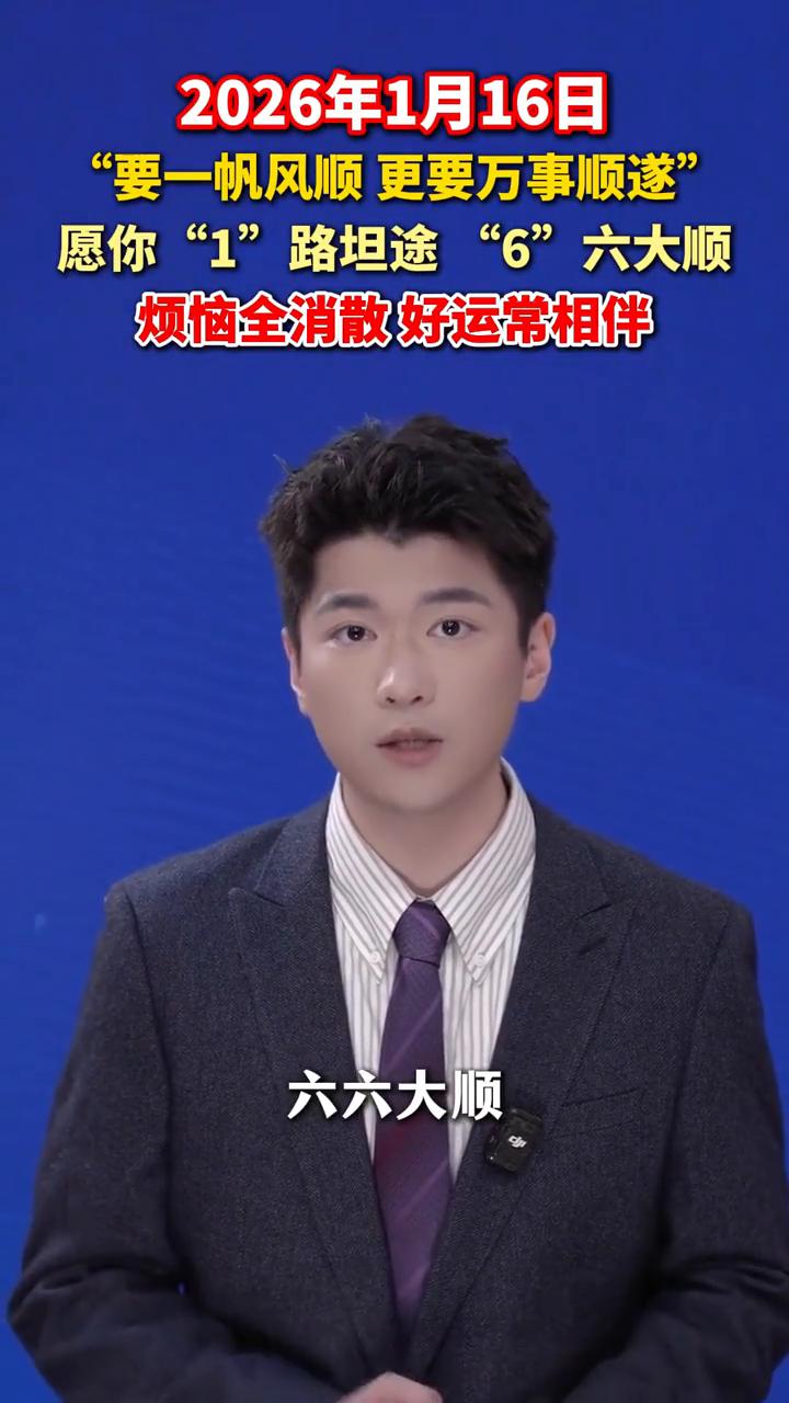 2026年1月16日,"要一帆风顺更要万事顺遂",愿你"1"路坦途"6"六大顺,烦恼全消散好运常相伴。 今天是2026年1月16号,16就是"要顺",要一帆风顺更要万事顺遂,顺遂和欢喜从今天开始伴你一整年。愿你一路坦途,六六大顺,烦恼全消散,好运常相伴。愿你每个朝夕都开开心心,有温暖和好运时时围绕,把这一年的顺遂如意,平安喜乐都接回家。种下的努力生根,发出了心疼。2026年寄语 2026祝福语 2026年寄语 2026祝福语 过好2026年 2026年历 2026年运势 对2026许愿 好运2026